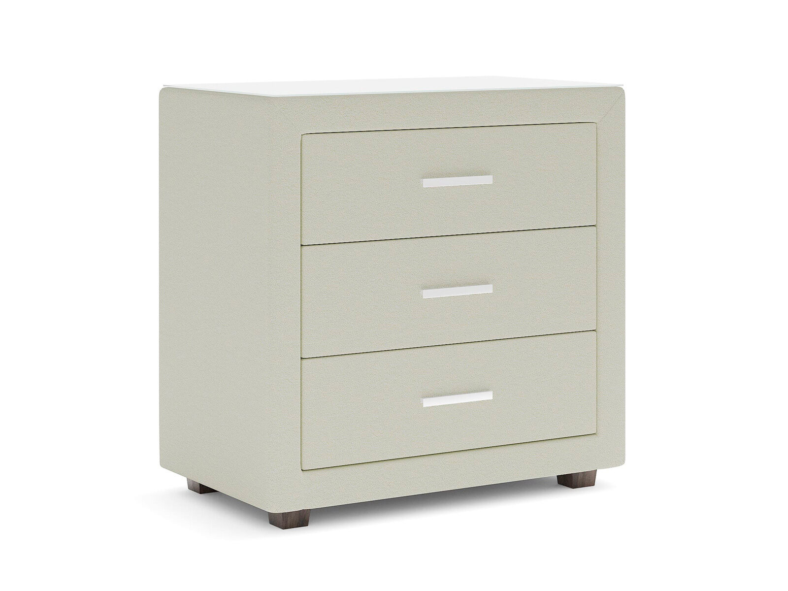 Элегантный комод отличается стильным дизайном и повышенным удобством. Три выдвижных ящика оснащены надёжными направляющими, обеспечивающими лёгкое открытие. Фасад ящиков и стенки комода покрыты обивочным материалом.