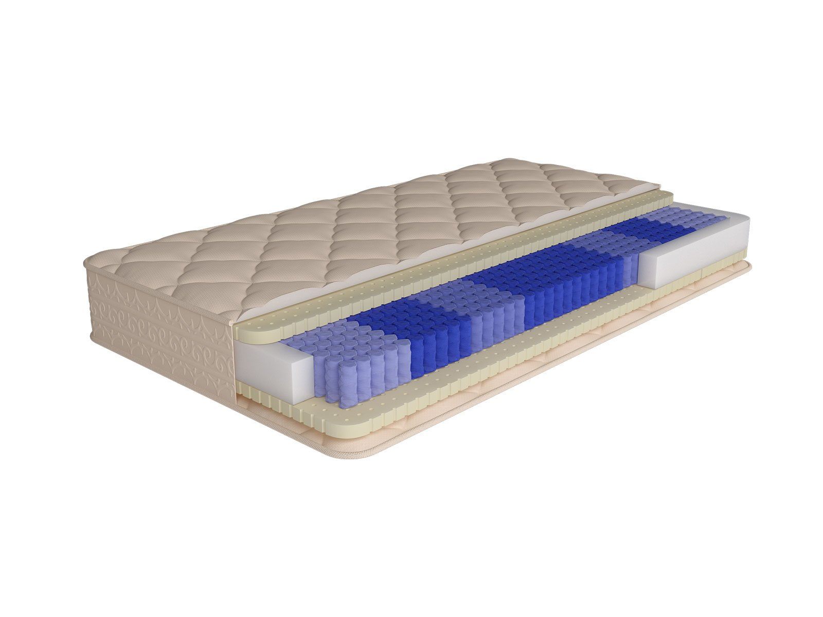 Две промежуточные зоны имеют среднюю жесткость и увеличивают ортопедичность матраса. Для зон, поддерживающих ноги и голову, используется очень мягкий пружинный блок, обеспечивающий горизонтальное положение шейного отдела позвоночника и улучшающий кровообращение нижних конечностей.