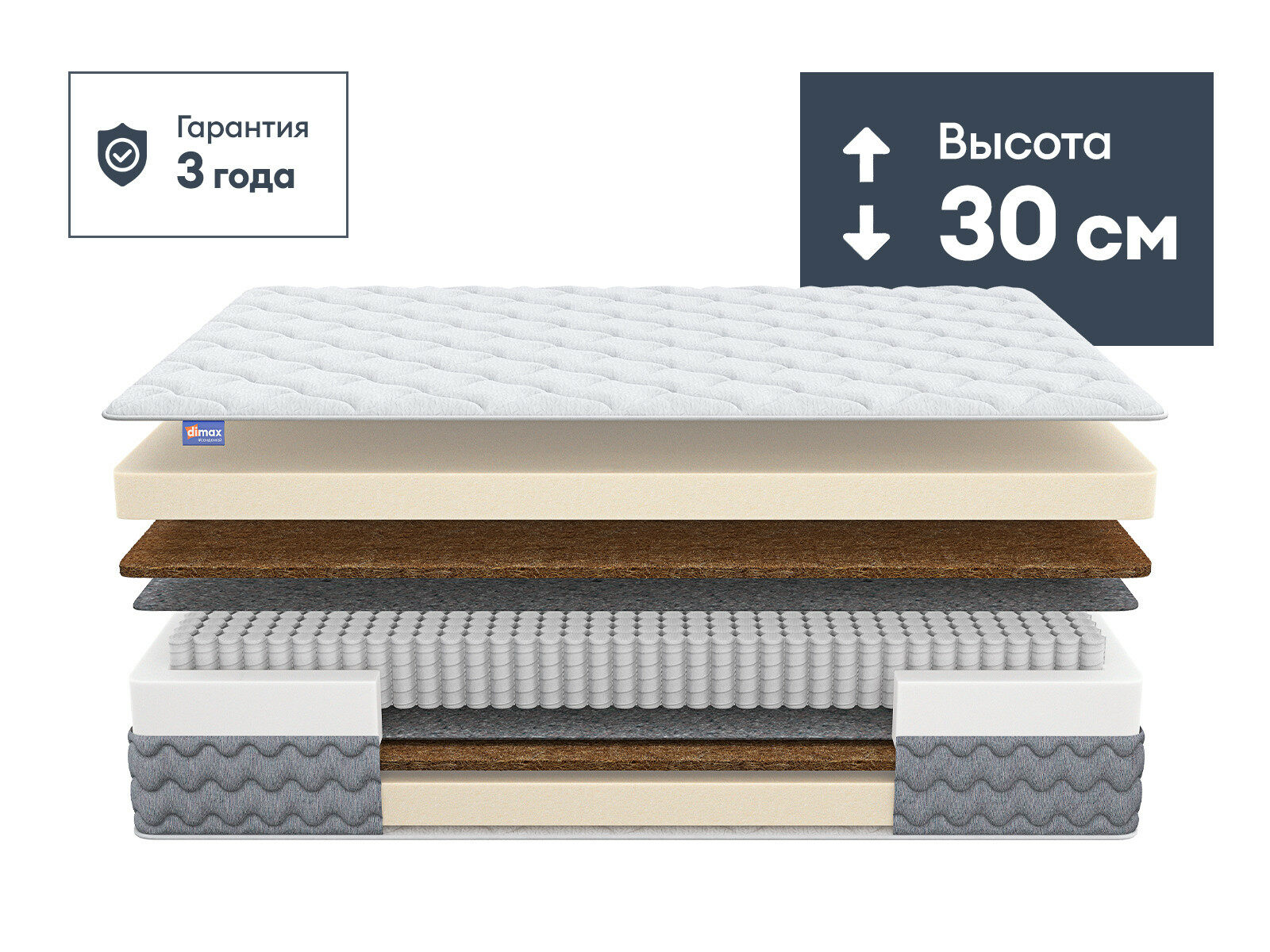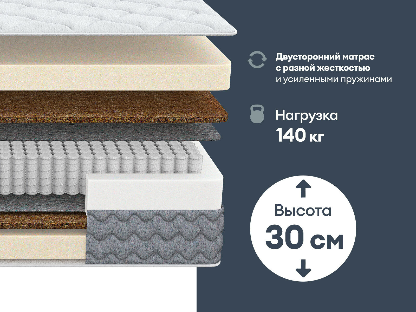 Димакс Биг Хард Базис — матрас усиленный, многослойный, разработанный для тех, кто ценит комфортный сон и долговечность материалов. Сочетание латекса, кокосовой койры и блока S1000 создаёт основу, устойчивую к нагрузкам до 140 кг на спальное место.