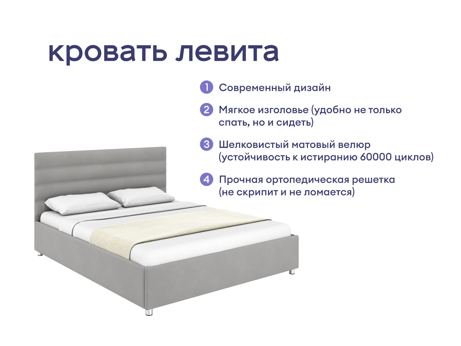 Кровать получила изящно выполненное стильное изголовье. Мягкая горизонтальная стёжка украшает модель и создаёт очень уютное пространство. Лаконичный и минималистичный дизайн позволяет универсально вписать мебель в любой современный интерьер. Кровать исполняется в обивке из велюра, которая имеет красивую мягкую фактуру и легко чистится. Сама кровать – её царги и изголовье изготавливается из прочного и надёжного ДСП. В комплект входит ортопедическое металлическое разборное основание.