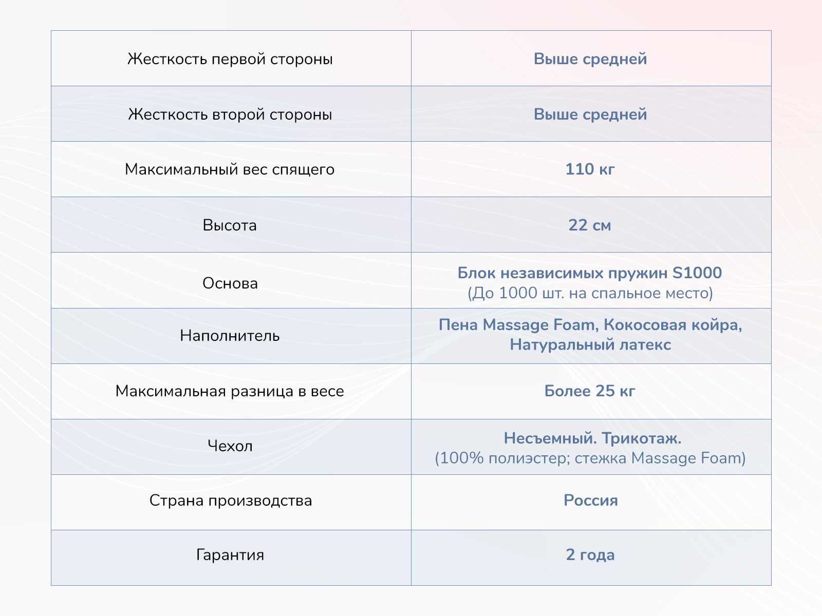 Двусторонний матрас Relmas Mix S1000 соответствует уровню жёсткости выше среднего. Модель дополнена массажной функцией – обе спальные поверхности изделия оказывают деликатное воздействие на тело.