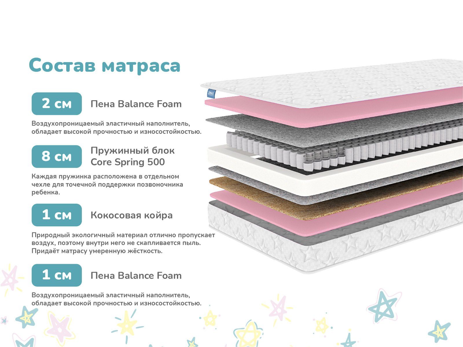 Матрас помогает ребёнку спокойно и с комфортом проводить время во сне, поддерживая здоровую осанку и обеспечивая уютную атмосферу каждую ночь.