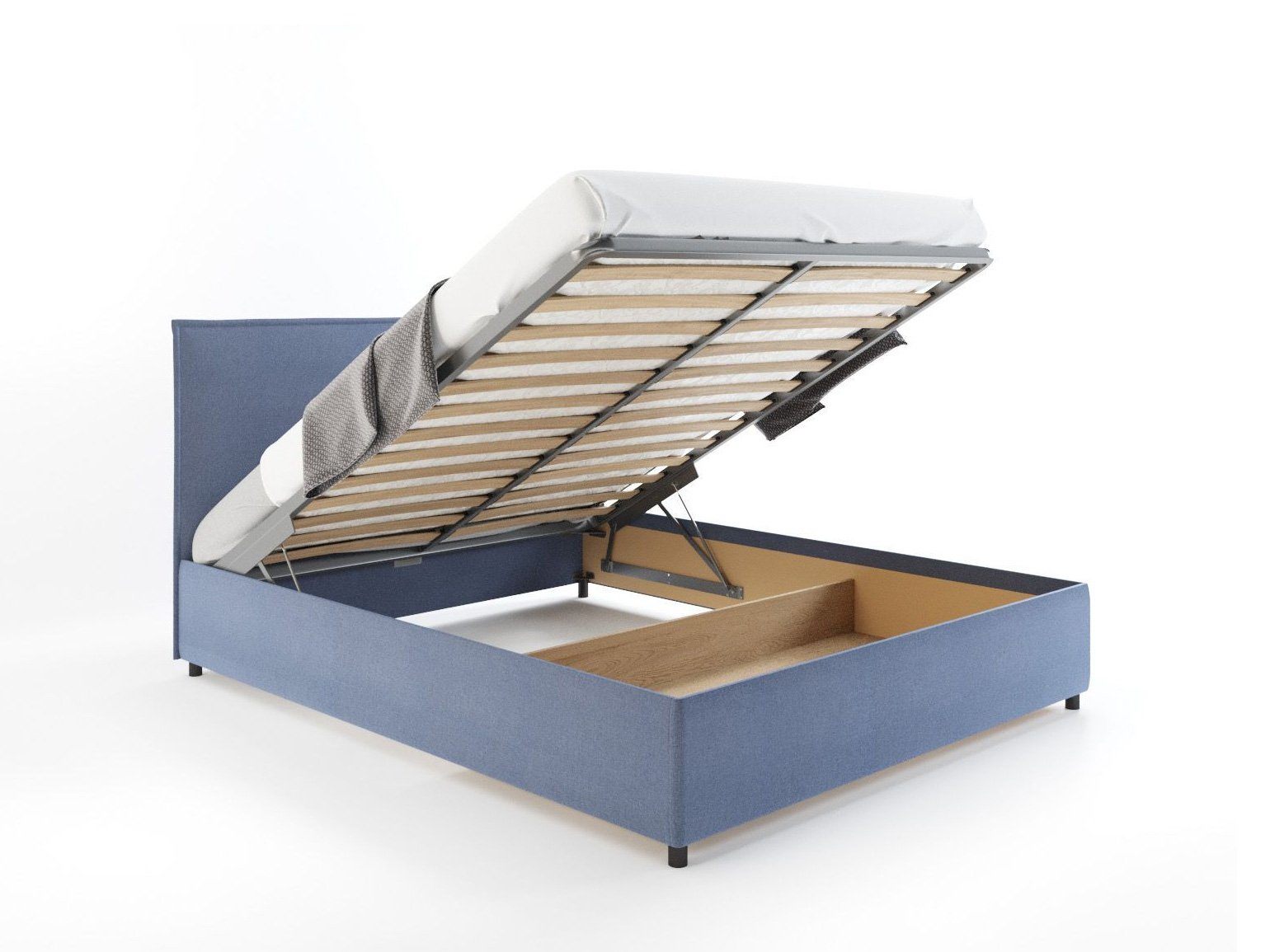 Каркас изголовья и царги кровати изготовлены из ДСП. Модель укомплектована подъемным механизмом с двумя газовыми амортизаторами. Опционально - кровать может быть укомплектована только металлическим основанием под матрас (без подъёмного механизма) или вовсе без основания и подъёмного механизма. Отсек для хранения постельных принадлежностей с вкладным полом на 1/2 кровати.