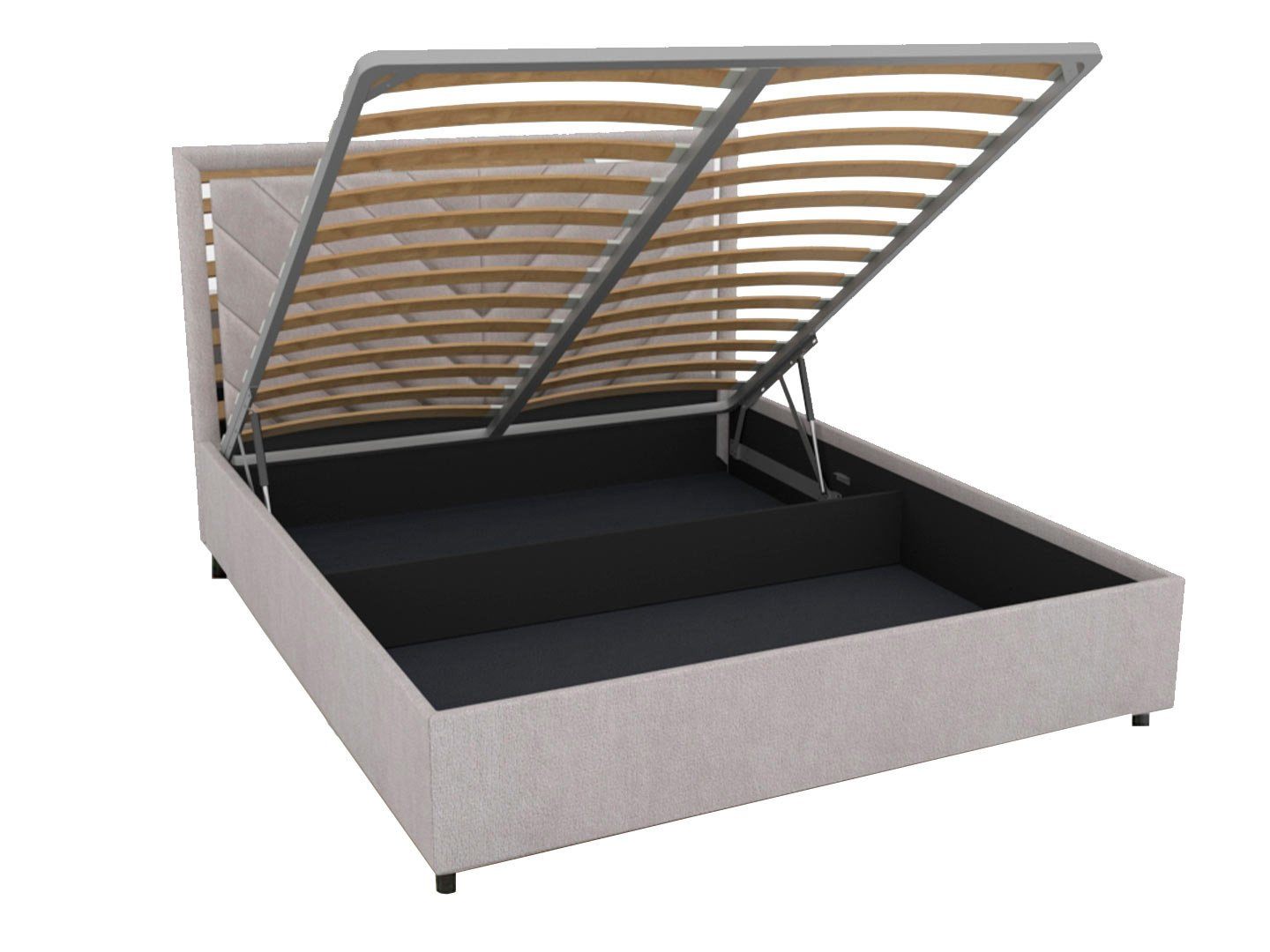 Кровать комплектуется металлическим основанием с подъемным механизмом и ящиком для белья.