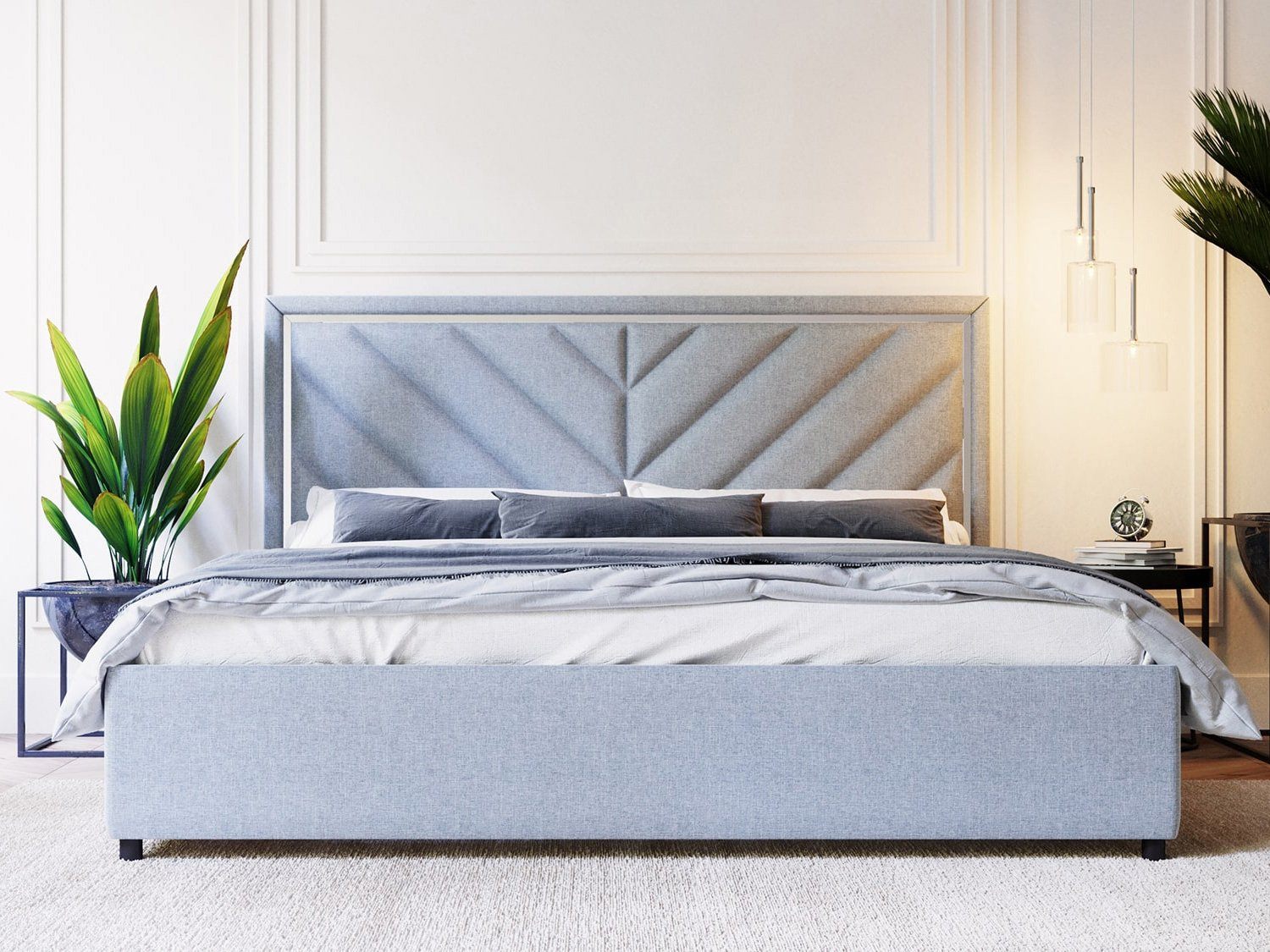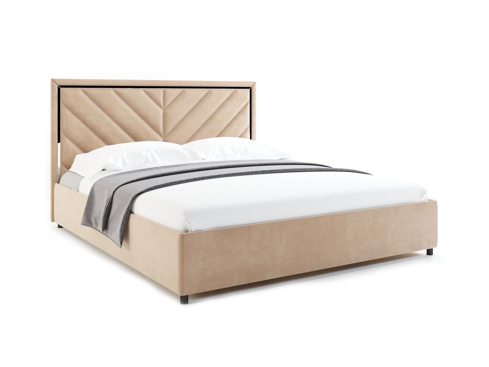 Виктория — кровать с высоким изголовьем в современном стиле. Изюминка модели — высокое мягкое изголовье с диагональными стяжками и зеркальной вставкой по периметру, которая создает яркие блики на свету.