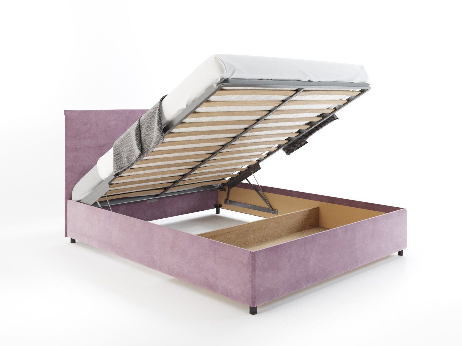 Каркас изголовья и царги кровати изготовлены из ДСП. Модель укомплектована подъемным механизмом с двумя газовыми амортизаторами. Опционально - кровать может быть укомплектована только металлическим основанием под матрас (без подъёмного механизма) или вовсе без основания и подъёмного механизма. Отсек для хранения постельных принадлежностей с вкладным полом на 1/2 кровати.