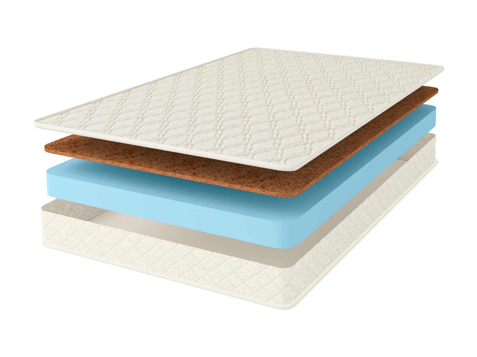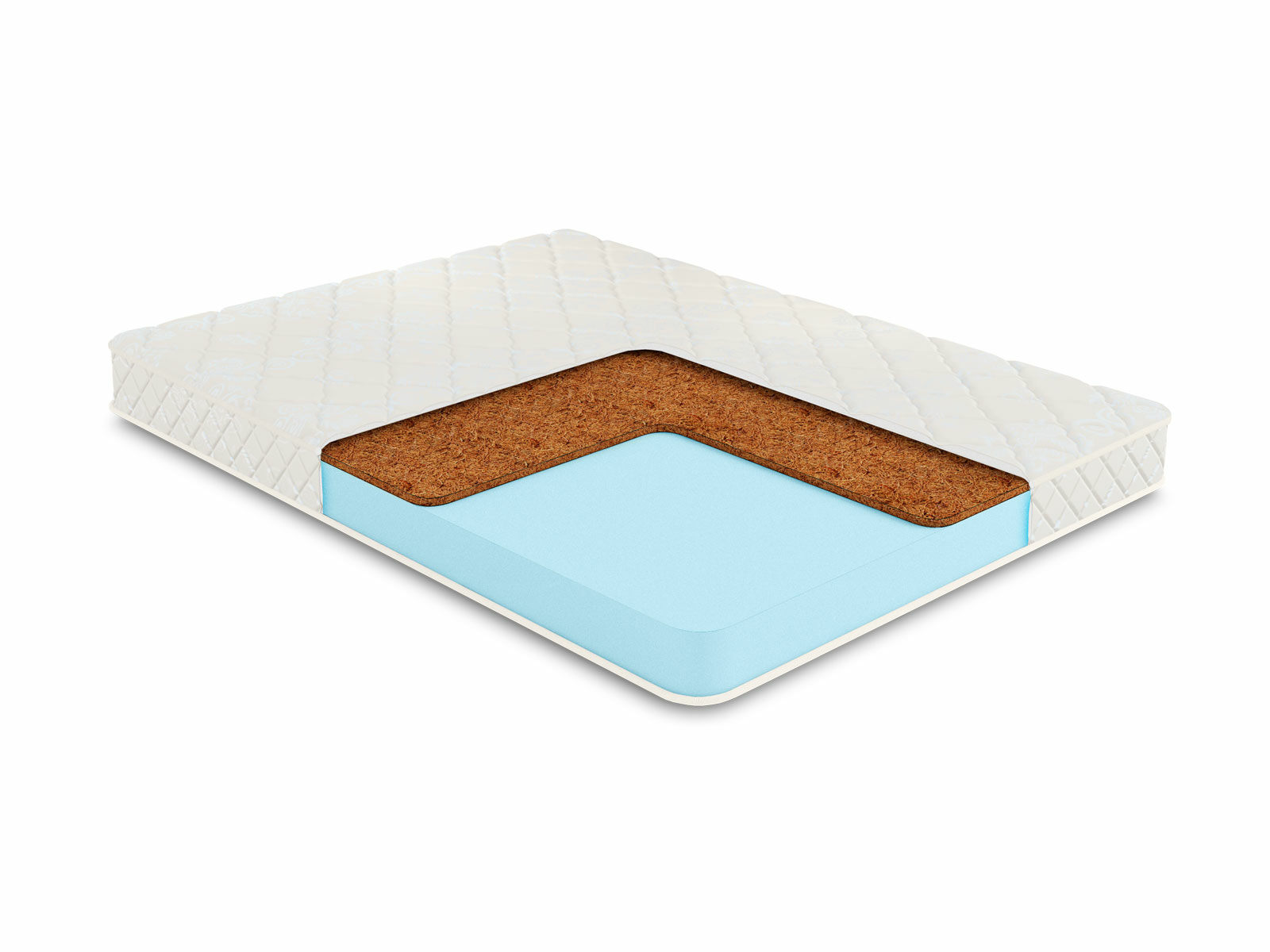 Другим слоем в матрасе установлена кокосовая койра. Данный наполнитель имеет жёсткую волокнистую структуру, которая позволяет удерживать позвоночник в анатомически правильном положении. Этот материал отличается ярко выраженными ортопедическими качествами.