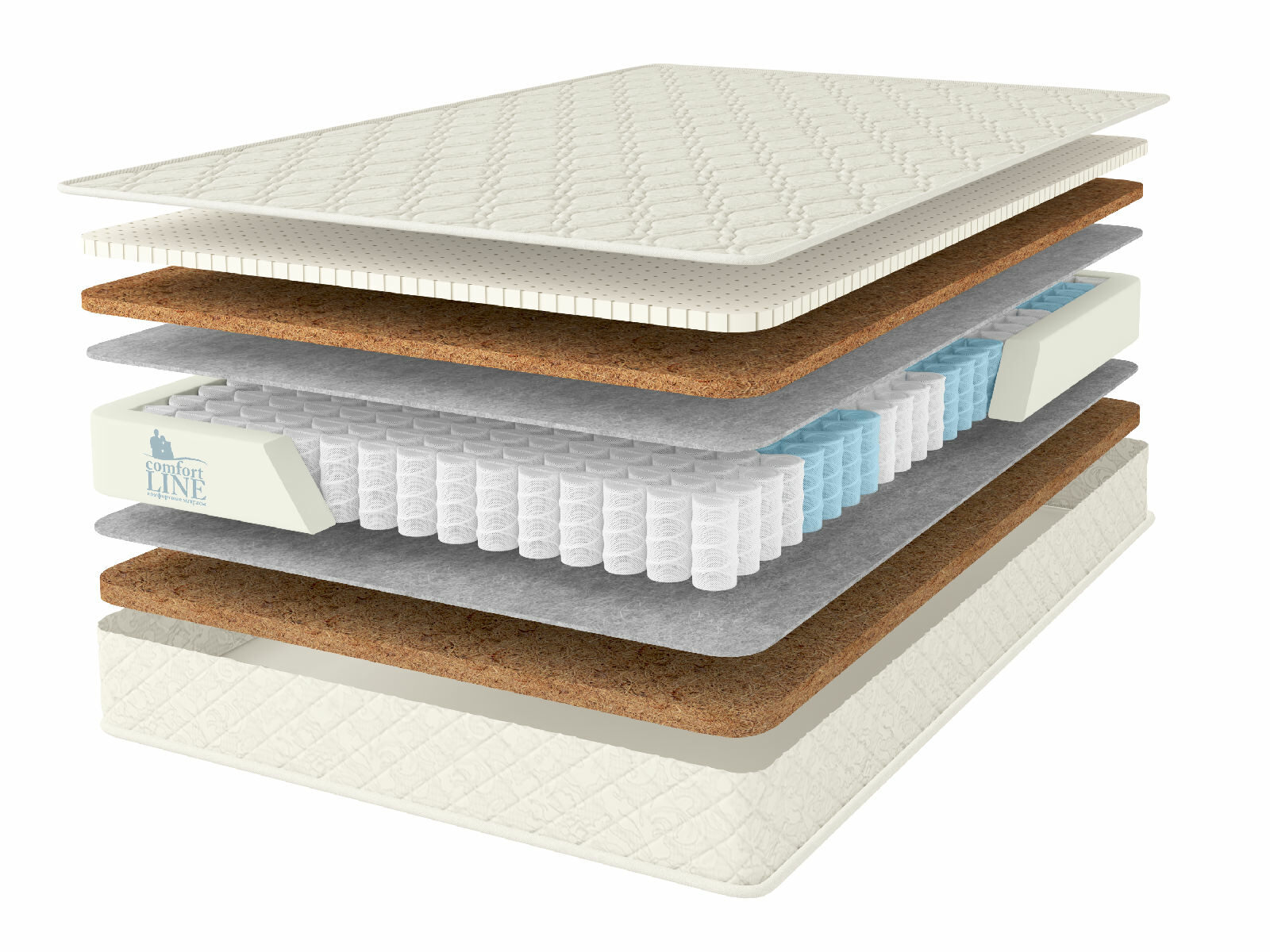 Однако самой важной деталью здесь конечно является пружинный блок TFK. Именно он выдерживает вес до 150 кг на спальное место и играючи распределяет нагрузку. Независимая работа пружин даёт матрасу ортопедические качества – модель подстраивается под естественные изгибы позвоночника, оказывая поддержку спине.