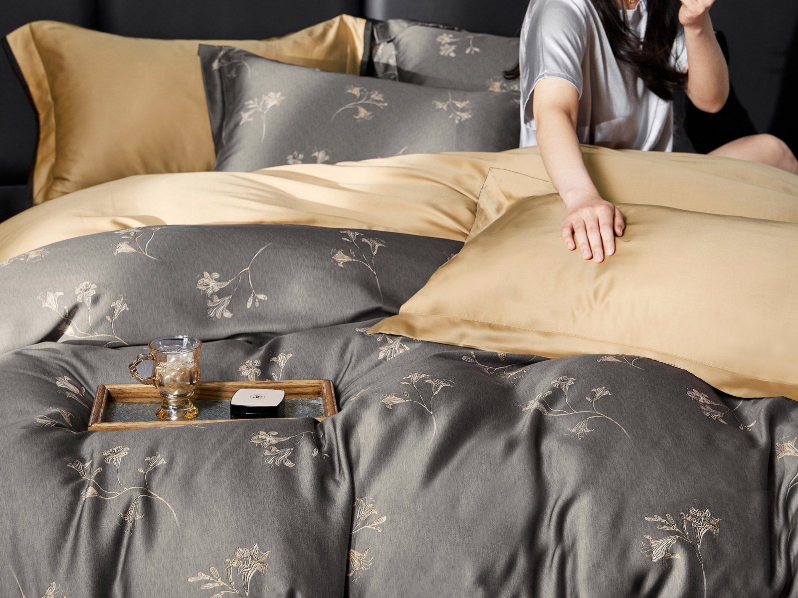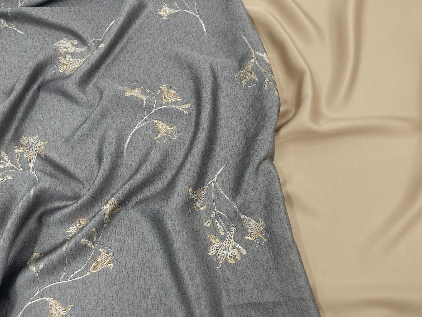 Лаконичный цветочный мотив дизайна Grace придется по вкусу поклонникам тихой роскоши. Глубокий серый в сочетании с теплым песочным - беспроигрышный дуэт для взрослой спальни.
