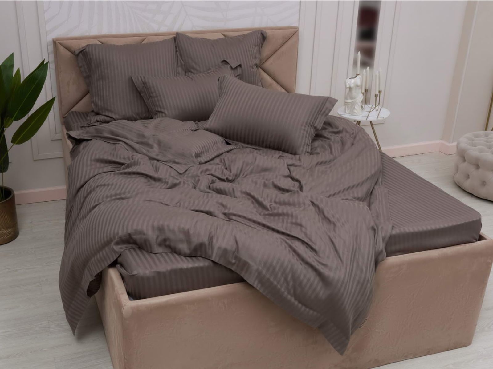 Постельное белье Моне, изготовленное из высококачественного страйп-сатина, станет украшением Вашей спальни. Комплекты представлены в 17 оттенках: от пастельных, до ярких насыщенных тонов. Такая палитра никого не оставит равнодушным. Особое плетение ткани образует узор в виде чередующихся полос, это придает постельному белью изысканность, гладкость и блеск.