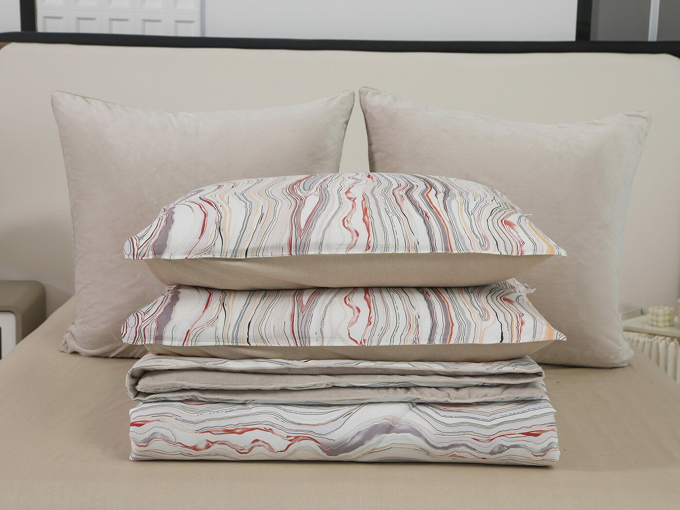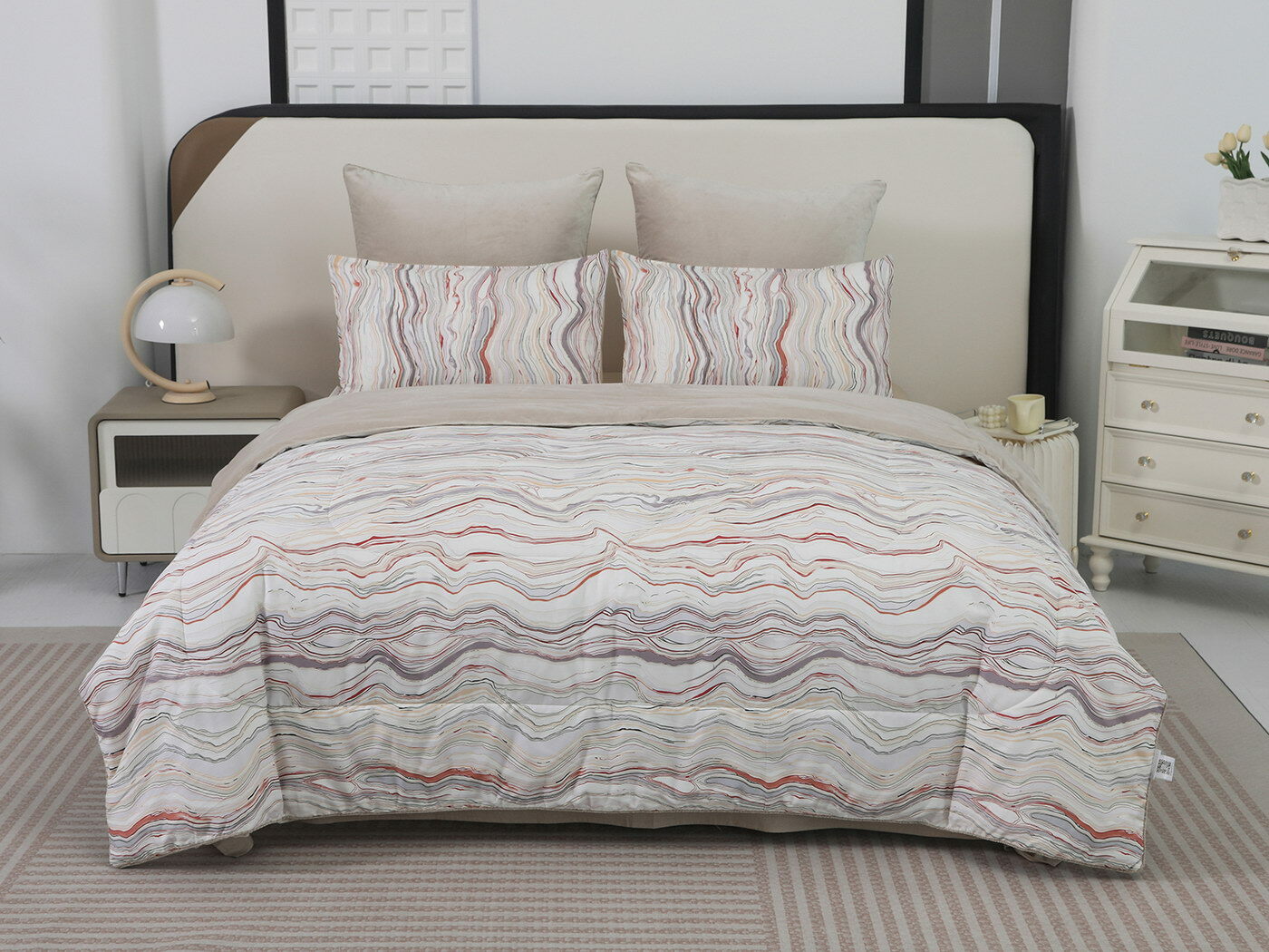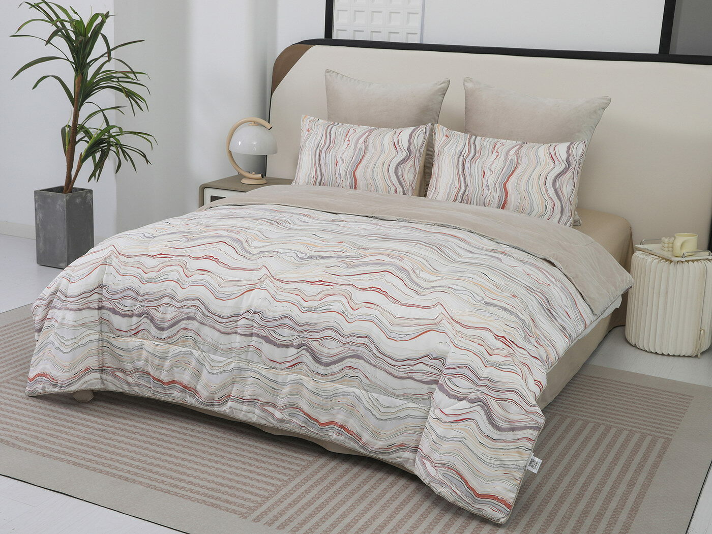 Обратная сторона одеяла – принтованный сатин натуральный хлопковый материал. На ощупь нежная и шелковистая, при этом комфортная и прочная ткань.