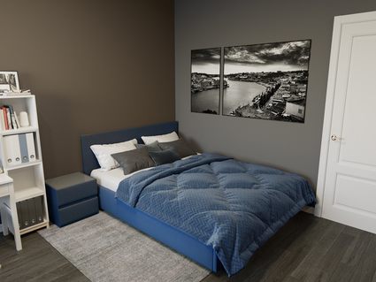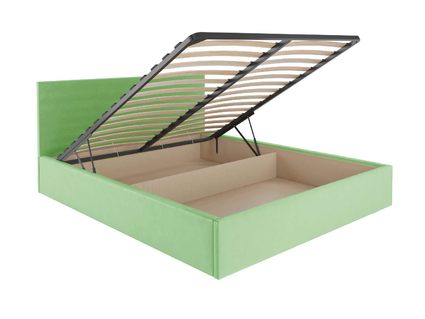 Кровать комплектуется металлическим основанием с подъемным механизмом, под которым находится вместительный бельевой ящик для хранения сезонных вещей и постельных принадлежностей.
