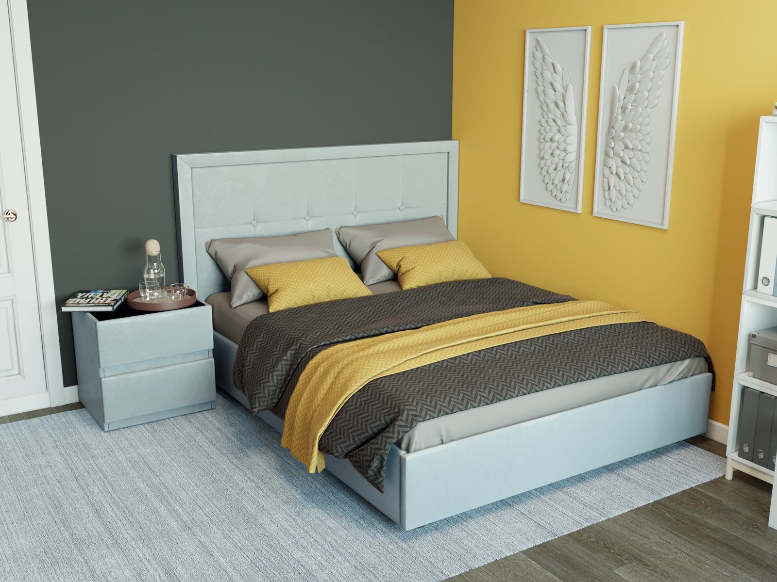 Кровать комплектуется металлическим основанием с подъемным механизмом, под которым находится вместительный бельевой ящик для хранения сезонных вещей и постельных принадлежностей.