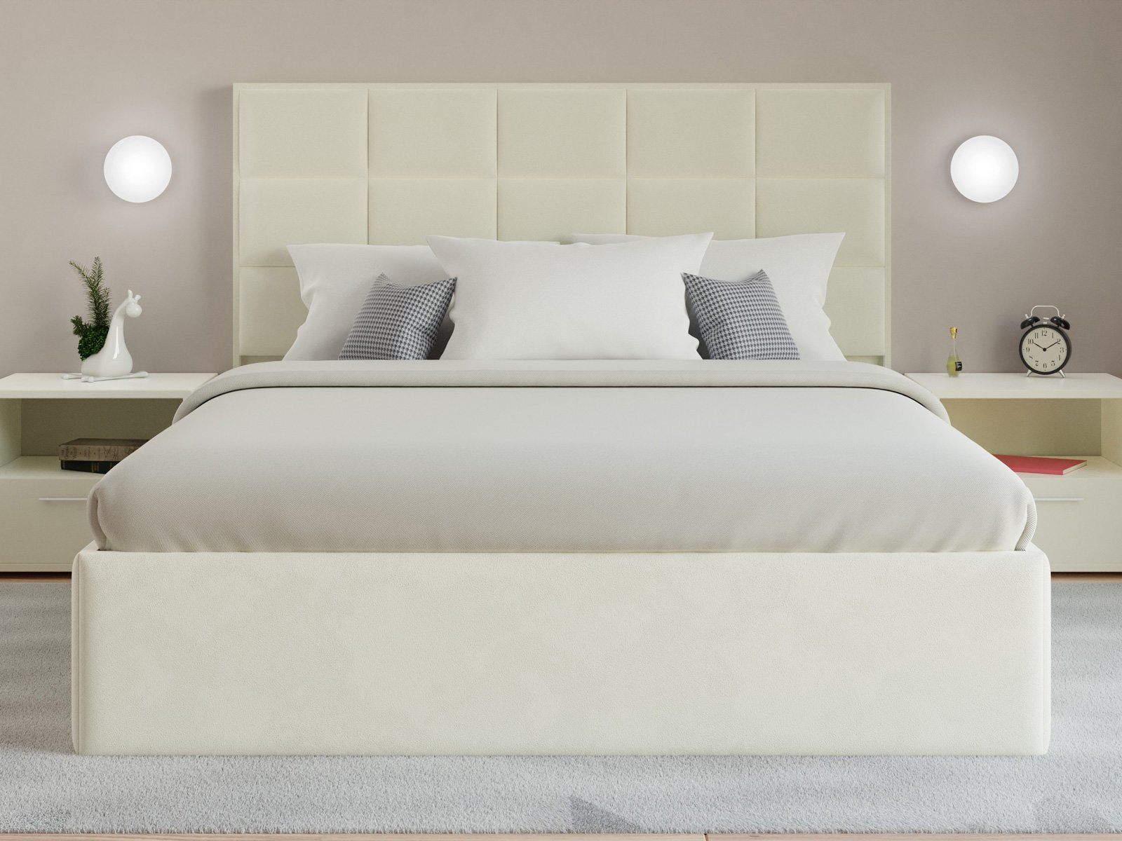 Мягкая кровать с обивкой из велюра.