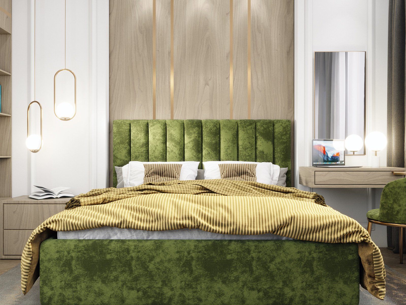 Кровать с мягким изголовьем, выполненным в виде 10 вертикальных панелей (вертикальная утяжка, всегда 10 шт независимо от размера спального места, с увеличением размера спального места увеличивается ширина панели), отличный вариант для спален с низкими потолками: вертикальный полосы на изголовье визуально вытягивают пространство.