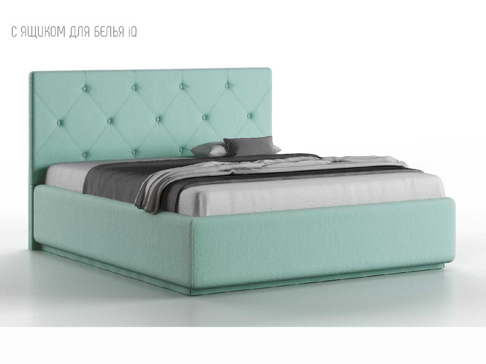 Кровать укомплектована IQ с подъемным механизмом и ящиком для белья без дна (дополнительная платная опция - дно к ящику IQ из HDF (ХДФ). Каркас кровати на цоколе, декоративный чехол на цоколе съёмный. Глубина ящика для белья - 30 см, без ограничения нагрузки на ящик.
