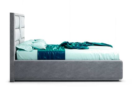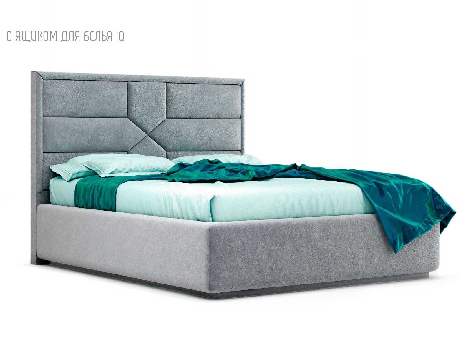 Кровать укомплектована IQ с подъемным механизмом и ящиком для белья без дна (дополнительная платная опция - дно к ящику IQ из HDF (ХДФ). Каркас кровати на цоколе, декоративный чехол на цоколе съёмный. Глубина ящика для белья - 30 см, без ограничения нагрузки на ящик.