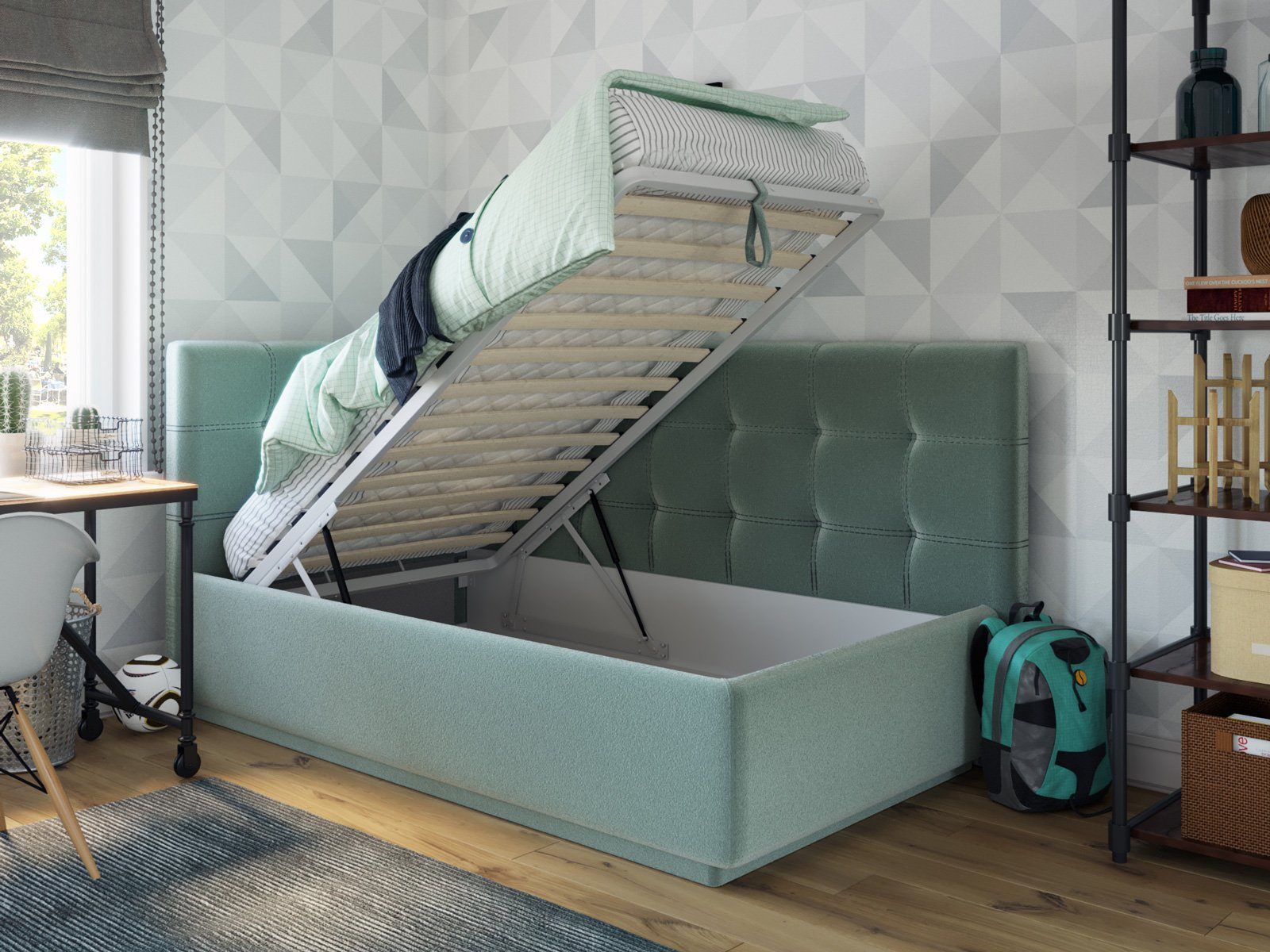 Кровать укомплектована IQ с подъемным механизмом и ящиком для белья без дна (дополнительная платная опция - дно к ящику IQ из HDF (ХДФ). Каркас кровати на цоколе, декоративный чехол на цоколе съёмный. Глубина ящика для белья - 30 см, без ограничения нагрузки на ящик.
