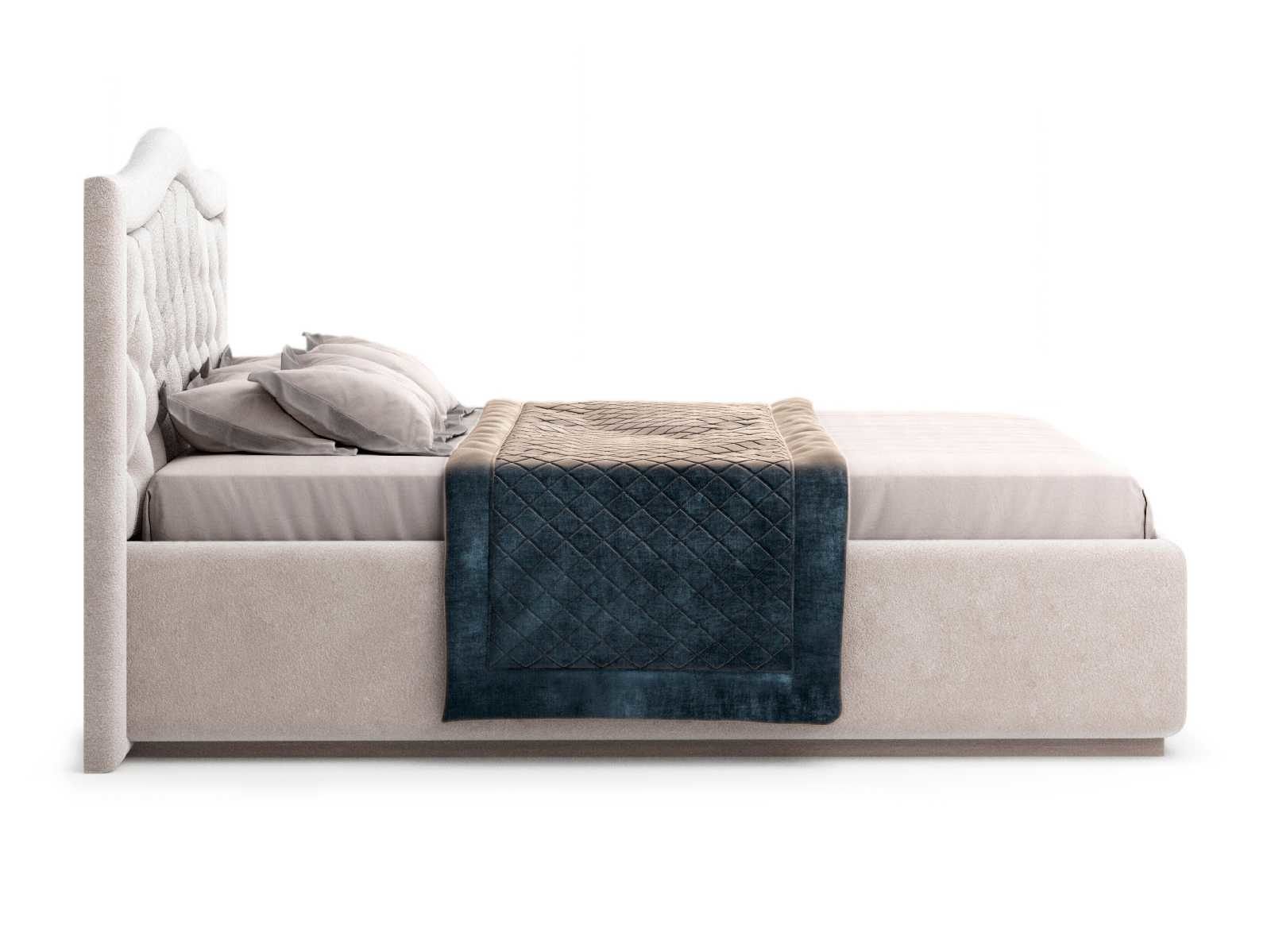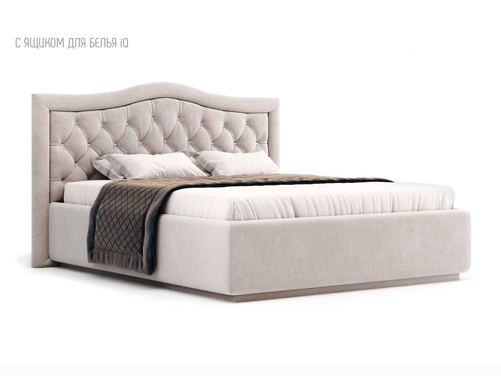 Кровать укомплектована IQ с подъемным механизмом и ящиком для белья без дна (дополнительная платная опция - дно к ящику IQ из HDF (ХДФ). Каркас кровати на цоколе, декоративный чехол на цоколе съёмный. Глубина ящика для белья - 30 см, без ограничения нагрузки на ящик.