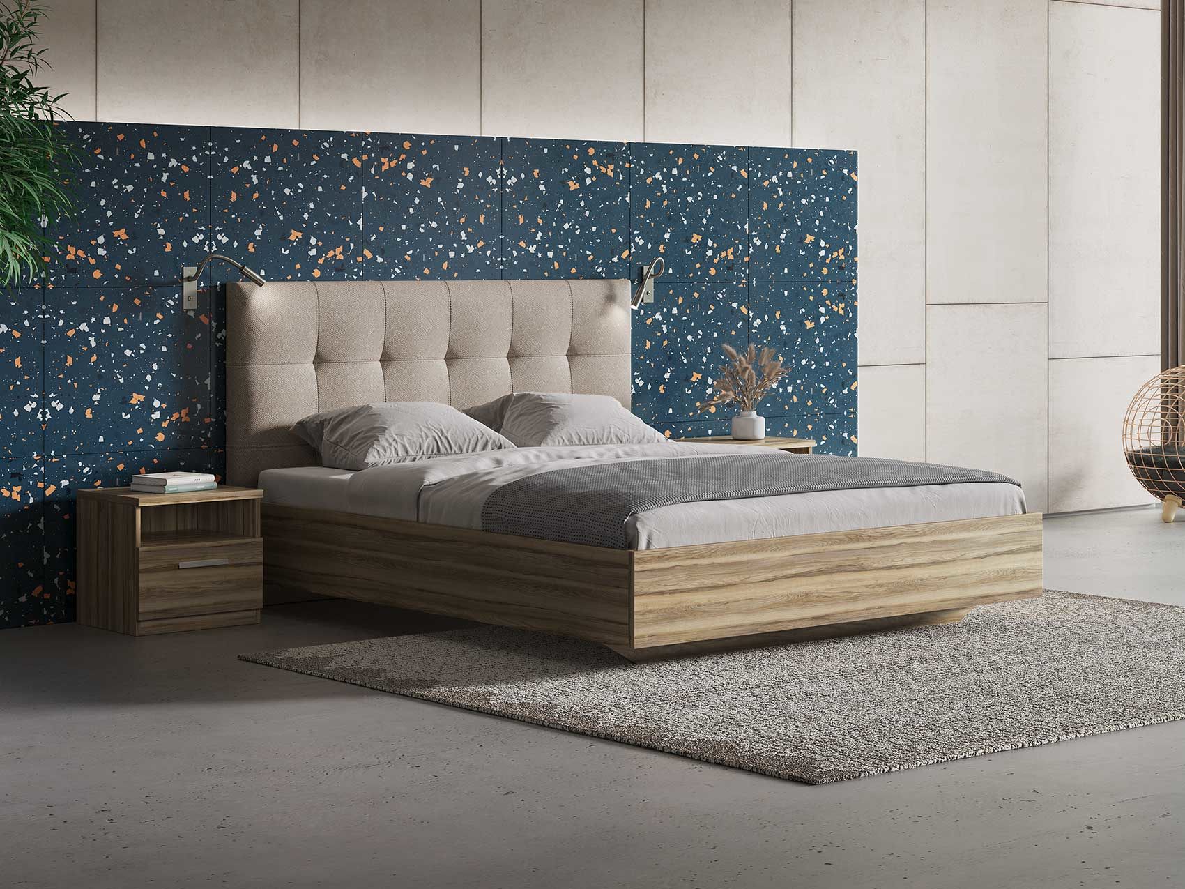 Vena – комбинированная кровать со стильным мягким изголовьем. Создает атмосферу уюта. Изголовье – со строгими квадратами. Двойная декоративная строчка вдоль них добавляет объема и элегантности. Сдержанный дизайн данной модели универсален для современных интерьеров. Кровать будет уникальной благодаря большой коллекции тканей и экокожи.