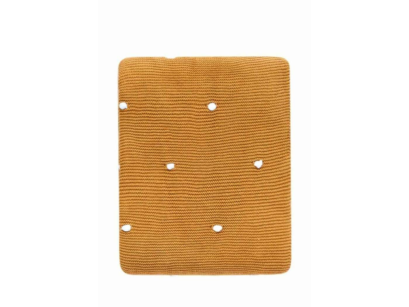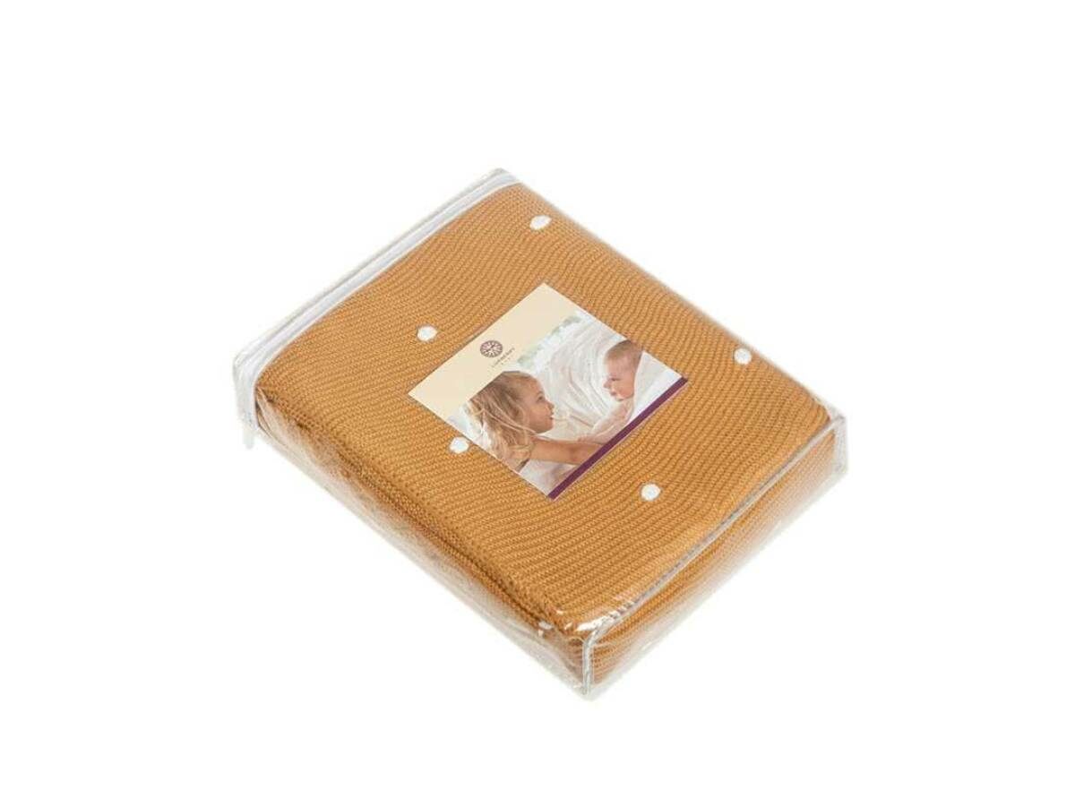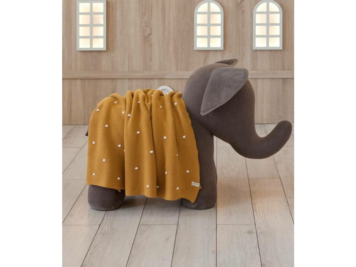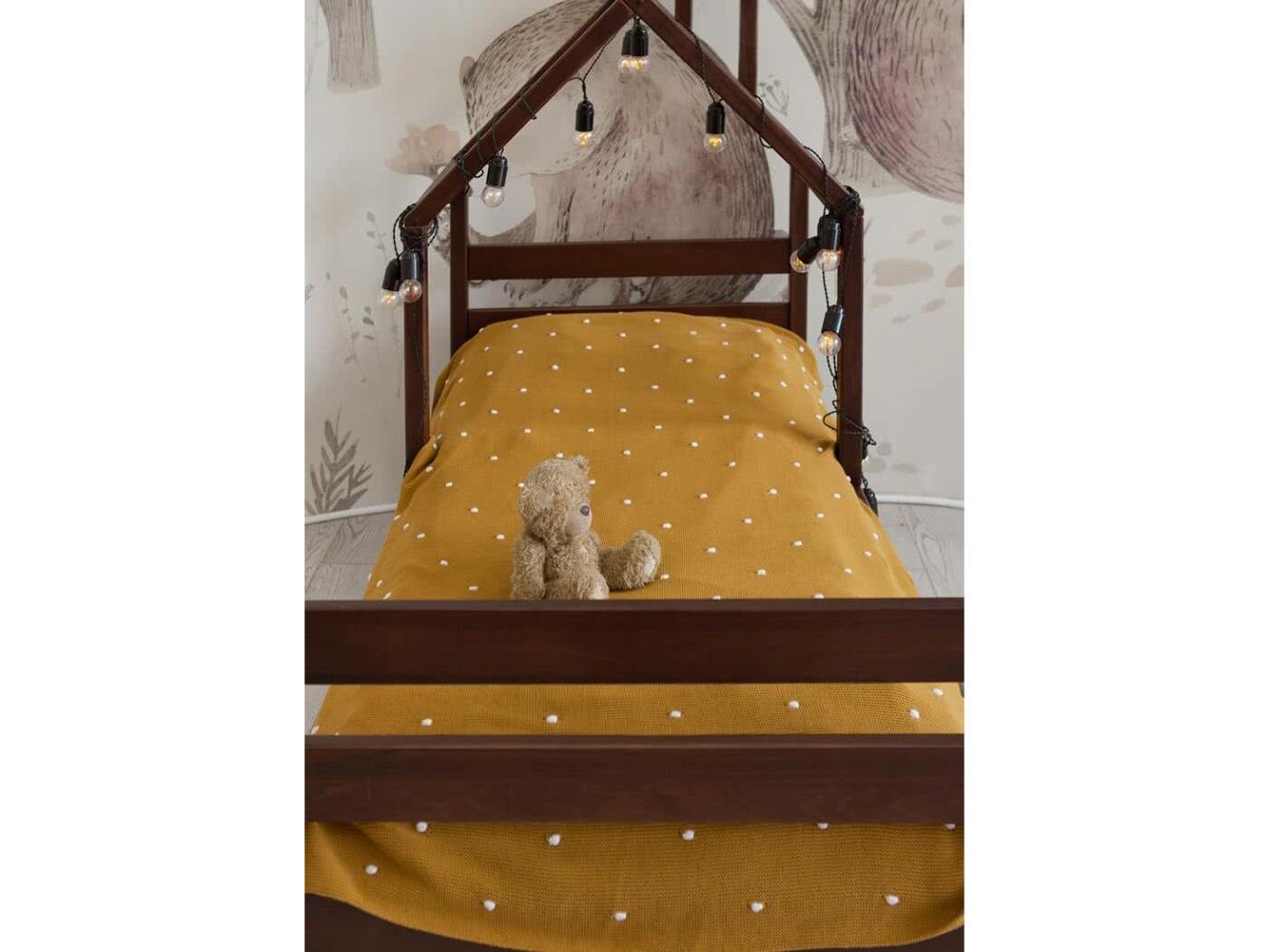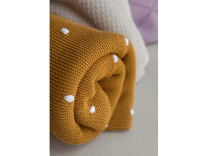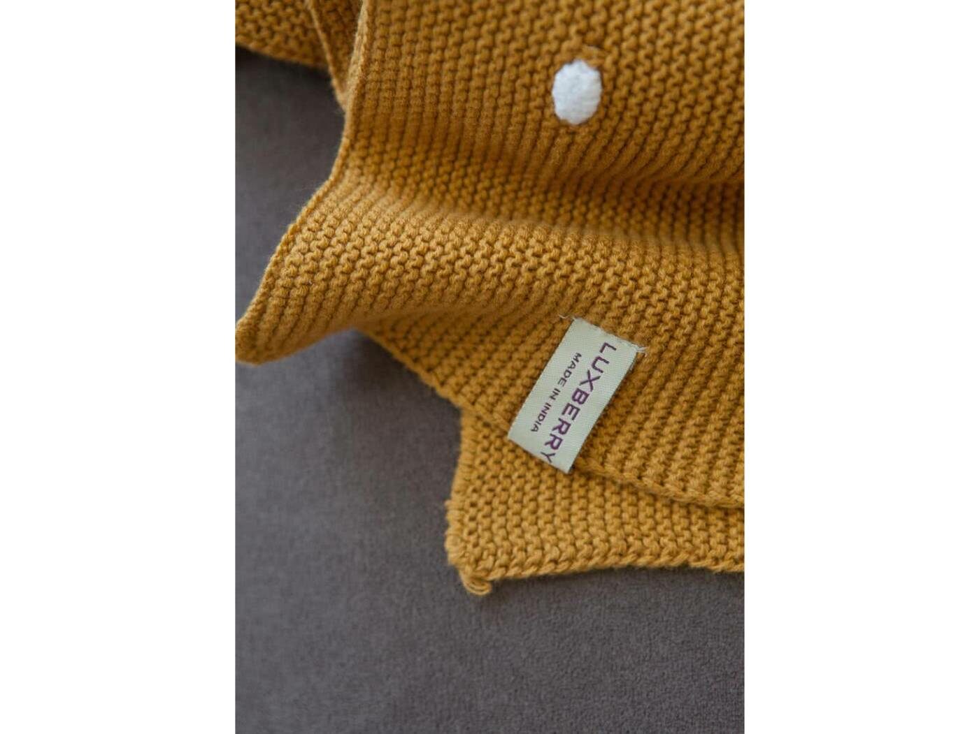 Вязанный пледик LUX 6 трендового горчичного цвета с белыми хлопковыми шишечками - дизайнерская находка для маленьких модников.