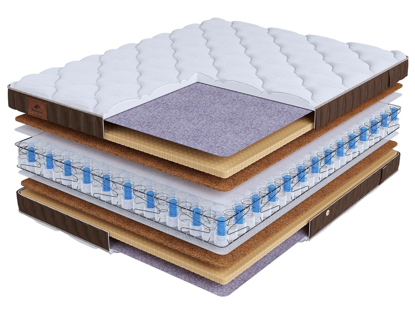 Хлопковая трикотажная ткань чехла обеспечивает комфорт и обладает отличной воздухопроницаемостью. Высокообъемная стежка с использованием холлофайбера (600гр.) подарит дополнительный комфорт спальному месту. Изысканный бурлет из мягкого велюра красивого бежевого цвета придает матрасу роскошный внешний вид и подчеркивает его премиальный статус. Каждая модель серии LIFE украшена фирменной кожаной биркой BeautySon, подтверждающая исключительность каждого матраса.