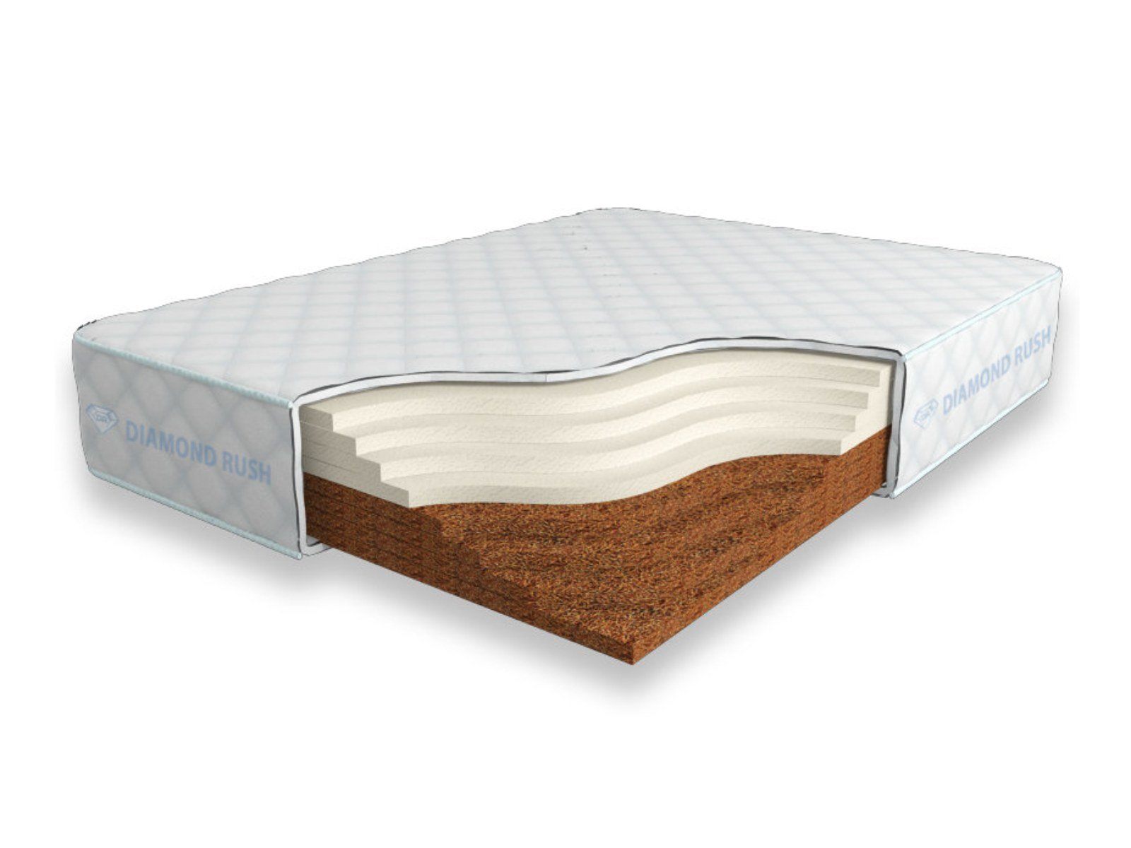 Матрас Diamond Rush Cocos Contrast 24 SD не имеет в своей основе пружинного блока. Особенность этой модели в том, что она сочетает в себе одновременно среднежесткий и максимально жесткий матрасы. С одной стороны идет один или несколько слоев латексированной кокосовой койры (3см), с другой - искусственного латекса (3см).