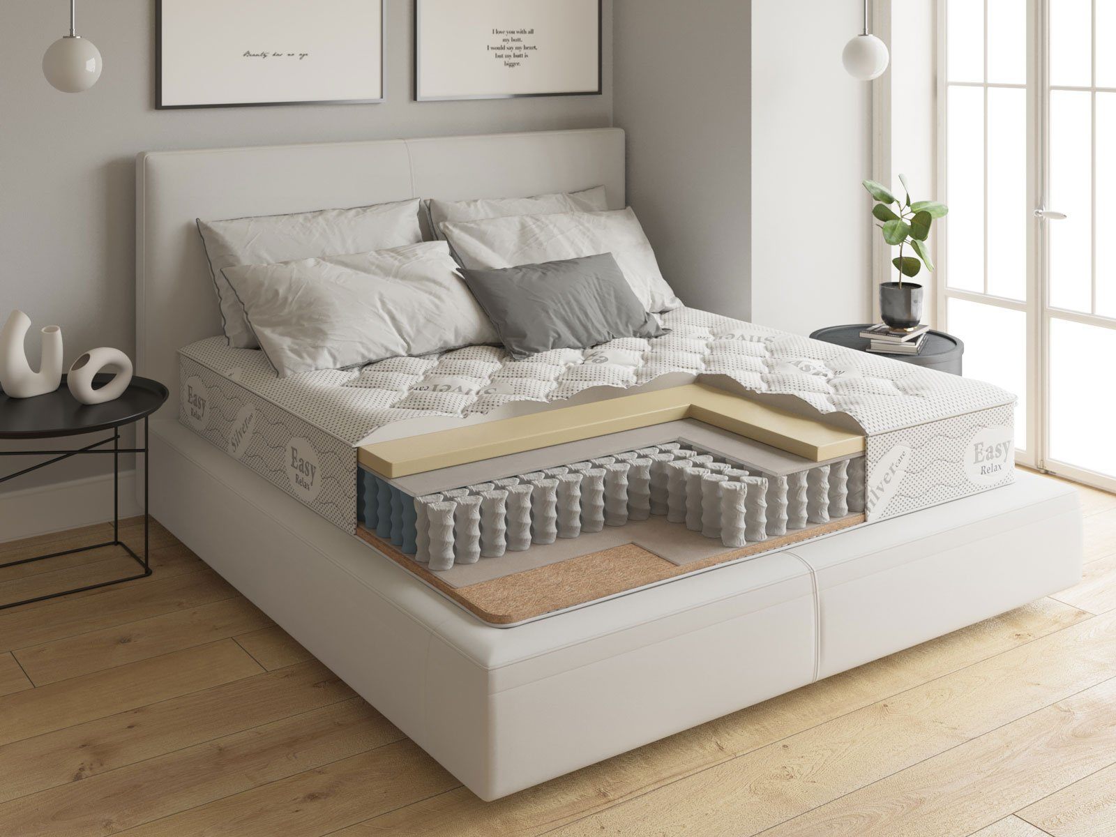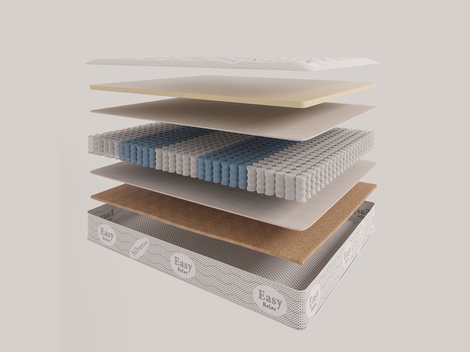 В качестве наполнителей используются латексная пена с памятью формы и кокос. Память формы снимает нагрузку с мышц спины и шеи, служит профилактикой сосудистых изменений и обеспечивает высокий анатомический эффект. Слой из кокосовой плиты служит гигиенической защитой спального места, поддерживает сухость внутри матраса и препятствует появлению неприятных запахов. Дополнительное усиление по периметру увеличивает срок службы матраса.