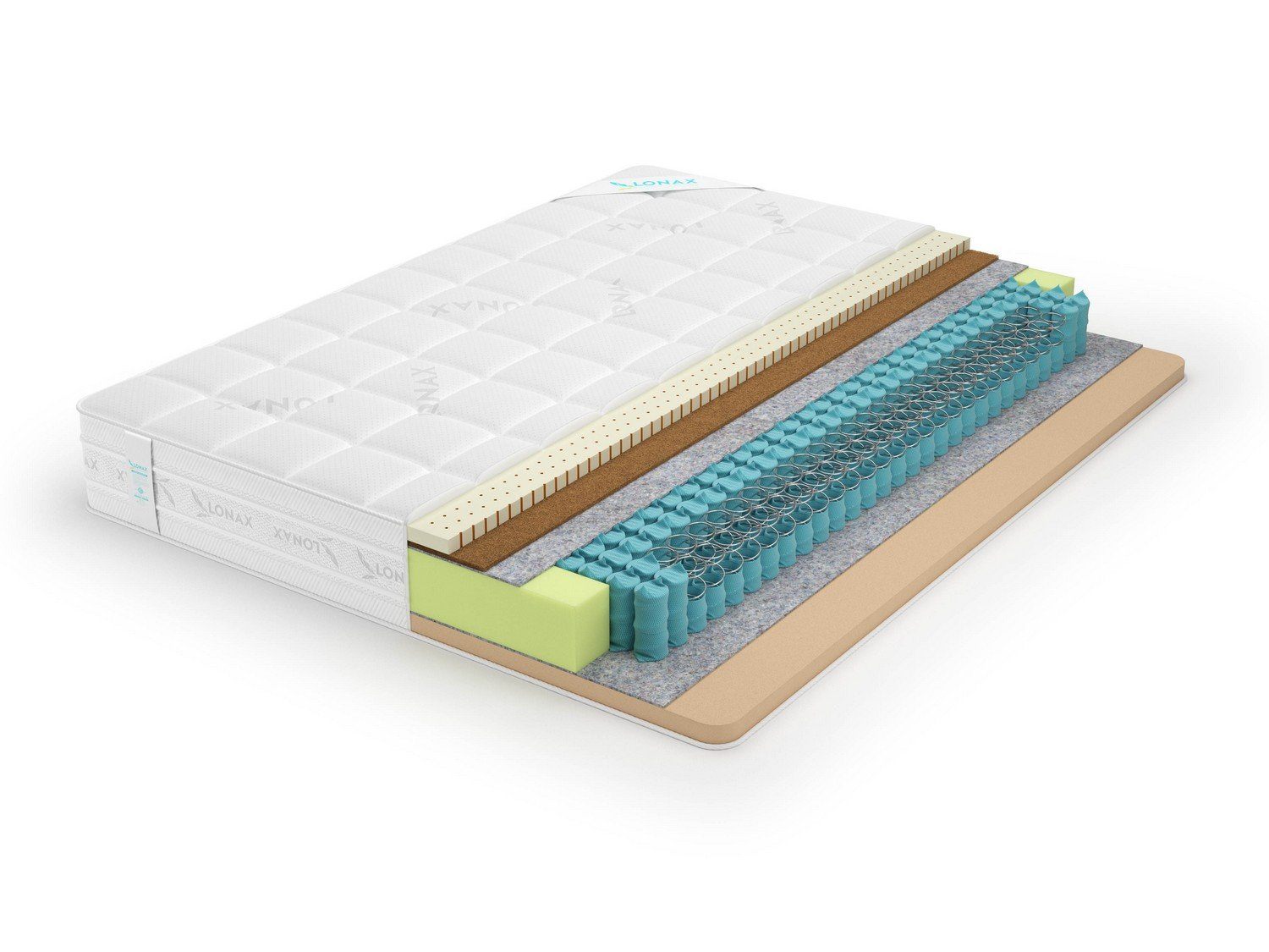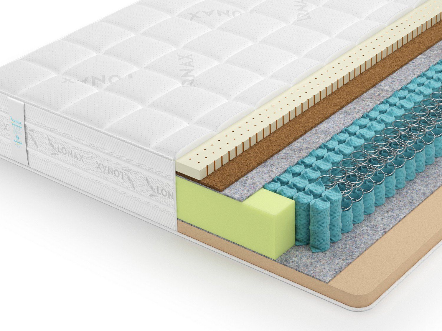 Матрас оббит серебристо-белым жаккардом, который украшает фирменный принт LONAX. Бурлет модели включает удобные пришивные ручки.
