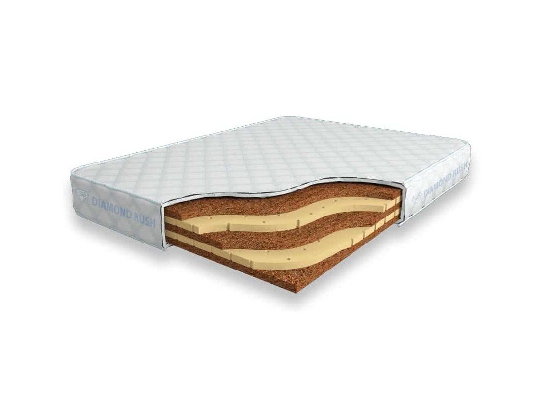 Данный матрас из серии Diamond Rush является беспружинным, т.е. не имеет в своей основе пружинного блока. В его состав входят одно или несколько чередований слоев латексированной кокосовой койры и натурального латекса с перфорацией. Все слои по 3 см. Такая модель матраса относится к среднежестким и обладает ортопедическим эффектом. В данной серии используется качественный чехол из трикотажа. Эта ткань безопасна для кожи, не боится стирки и химчистки.