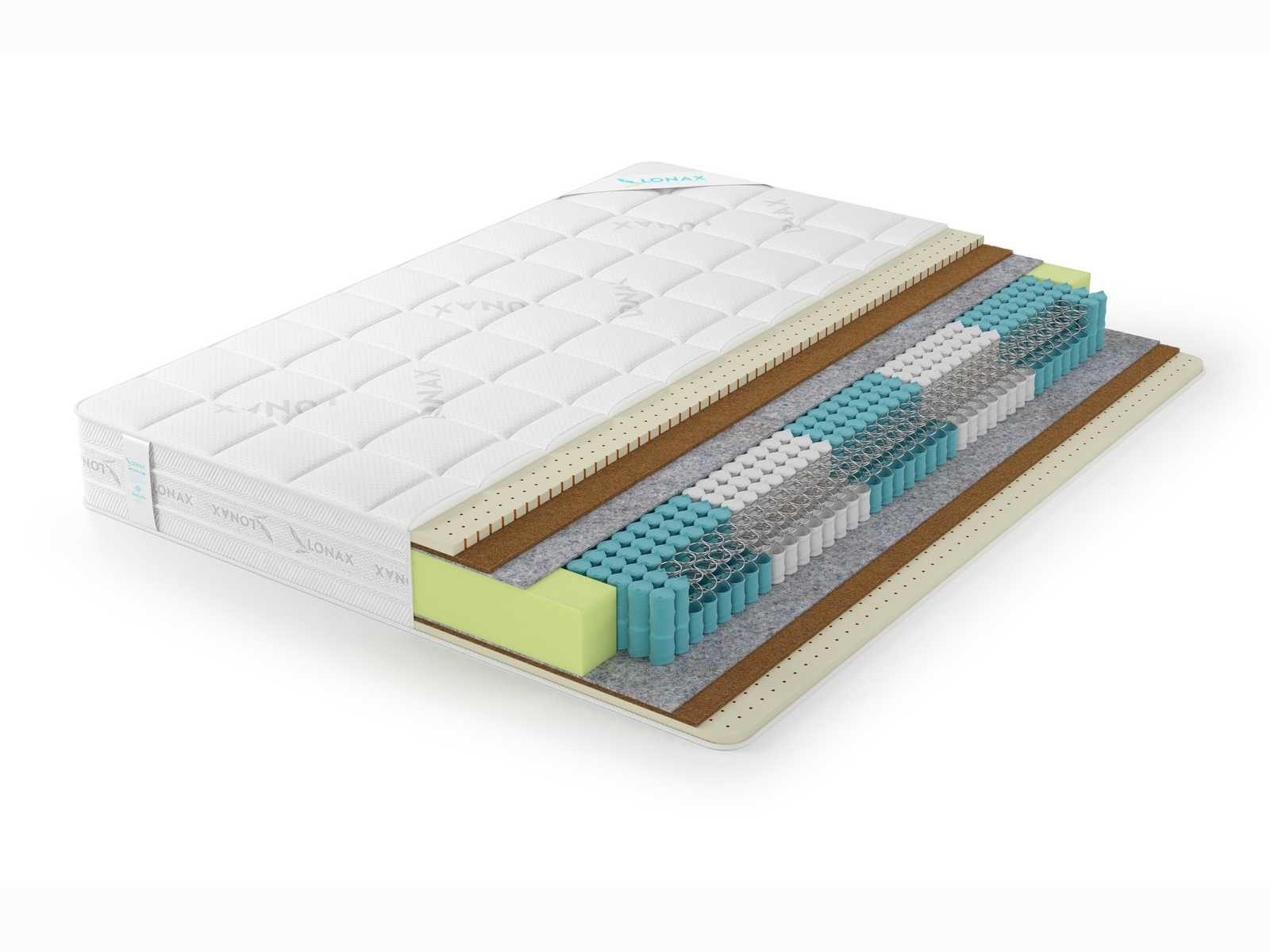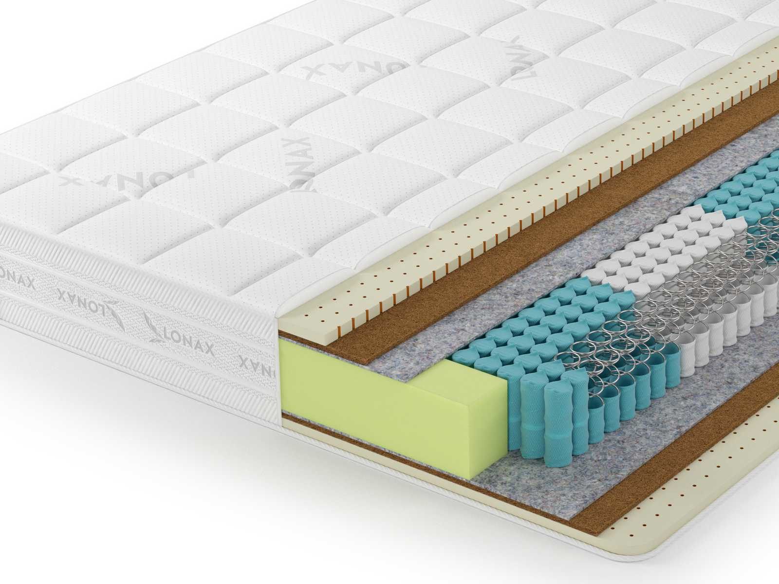 Двусторонний ортопедический матрас Lonax Medium Light S1000 5 Zone средней жесткости на основе натуральных наполнителей. Модель подойдет людям с большим весом до 100 кг.