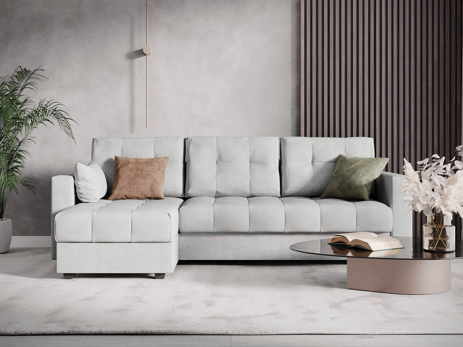Диван имеет угловую конфигурацию, что позволяет ему идеально вписаться в любой интерьер. Угловая секция, или оттоманка, устанавливается как справа, так и слева, в зависимости от предпочтений и особенностей планировки комнаты, делая диван универсальным решением для любого пространства. Модель оснащена вместительным бельевым коробом, что позволяет эффективно использовать пространство и хранить постельные принадлежности или другие вещи. Матрас средней жесткости обеспечивает оптимальную поддержку и комфорт во время сна, что важно для ежедневного использования.