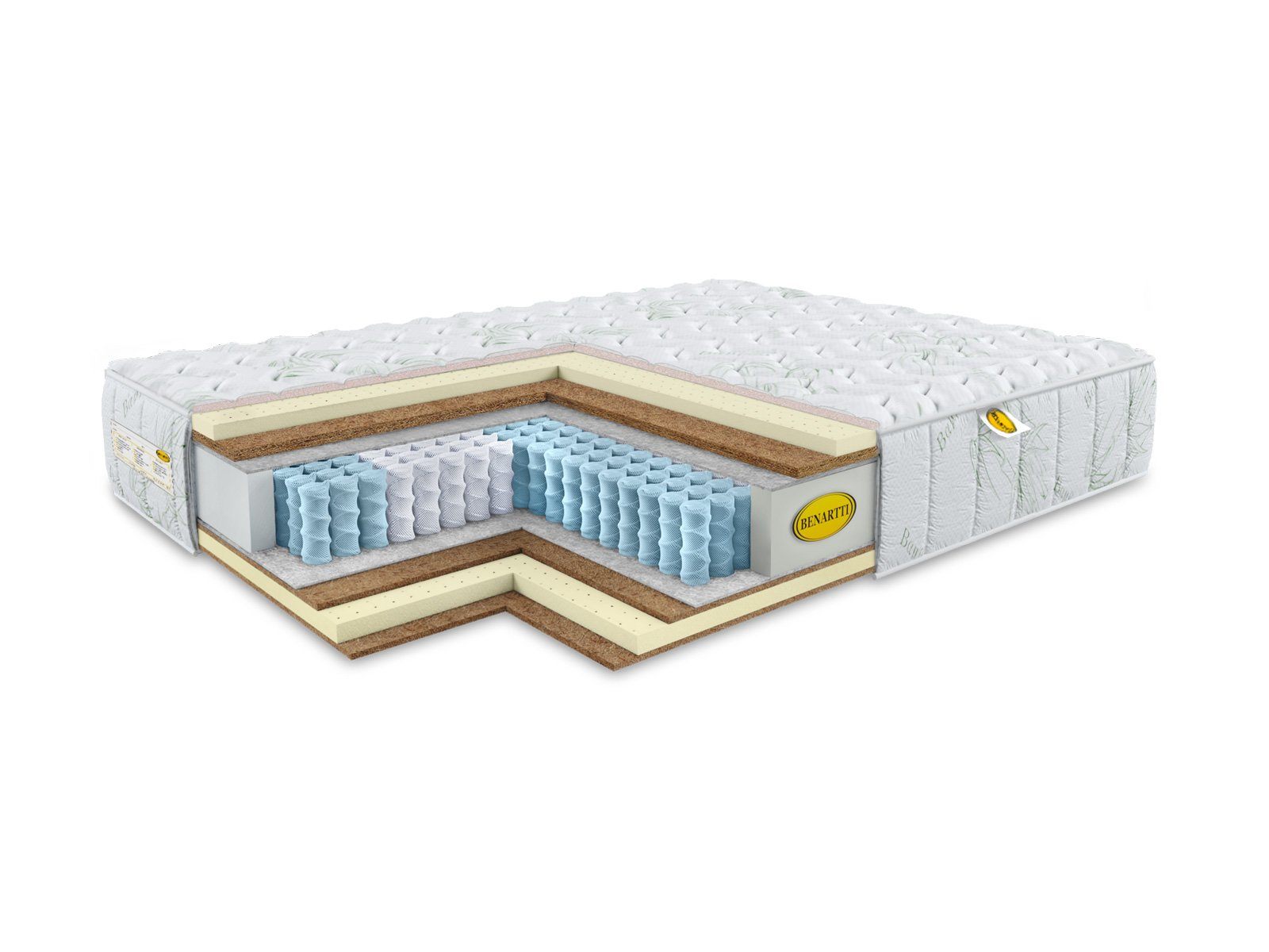 Внутри, кроме пружинного блока, установлены слои натуральных койры и латекса. Их различная комбинация с каждой из сторон обеспечивает средний и выше среднего уровни жёсткости поверхностей. Чтобы перевернуть изделие по бокам модели предусмотрены вшивные ручки.