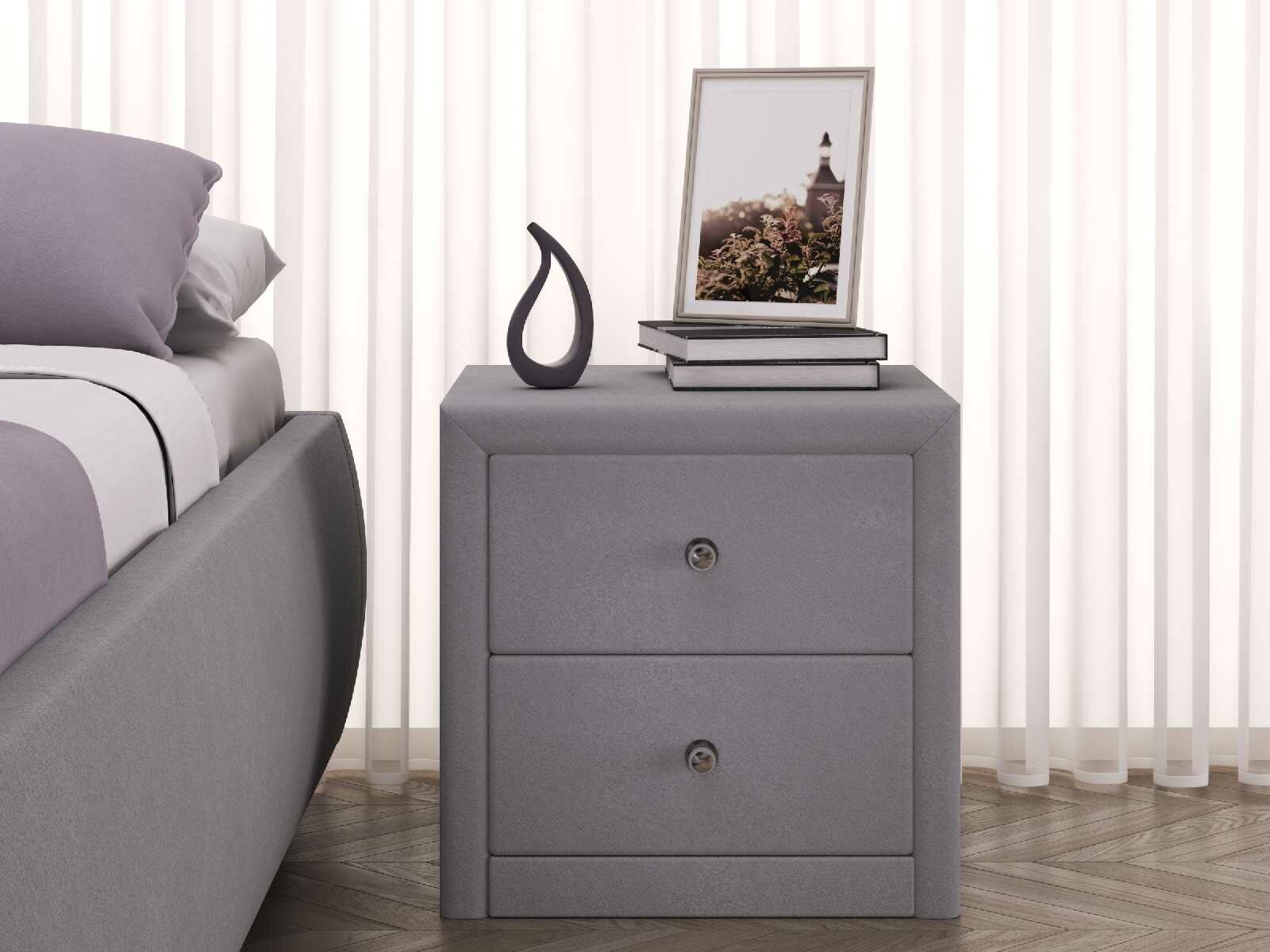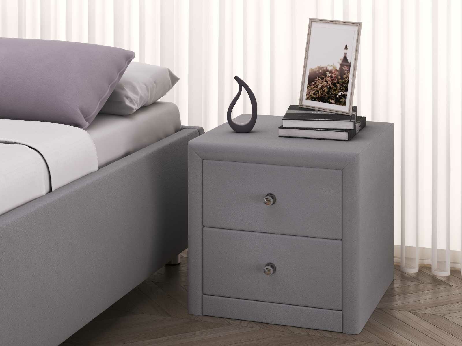 Прикроватная тумба «Мирано» самим своим видом создает атмосферу умиротворения, столь уместную в спальне. Прямые очертания модели подчеркнуты обивкой из качественной экокожи. На ровной поверхности тумбы можно расположить будильник, ночник, стакан с водой. В двух выдвижных ящиках хватит места для ночной косметики, маски для сна, гаджетов, нескольких книг для вечернего чтения.