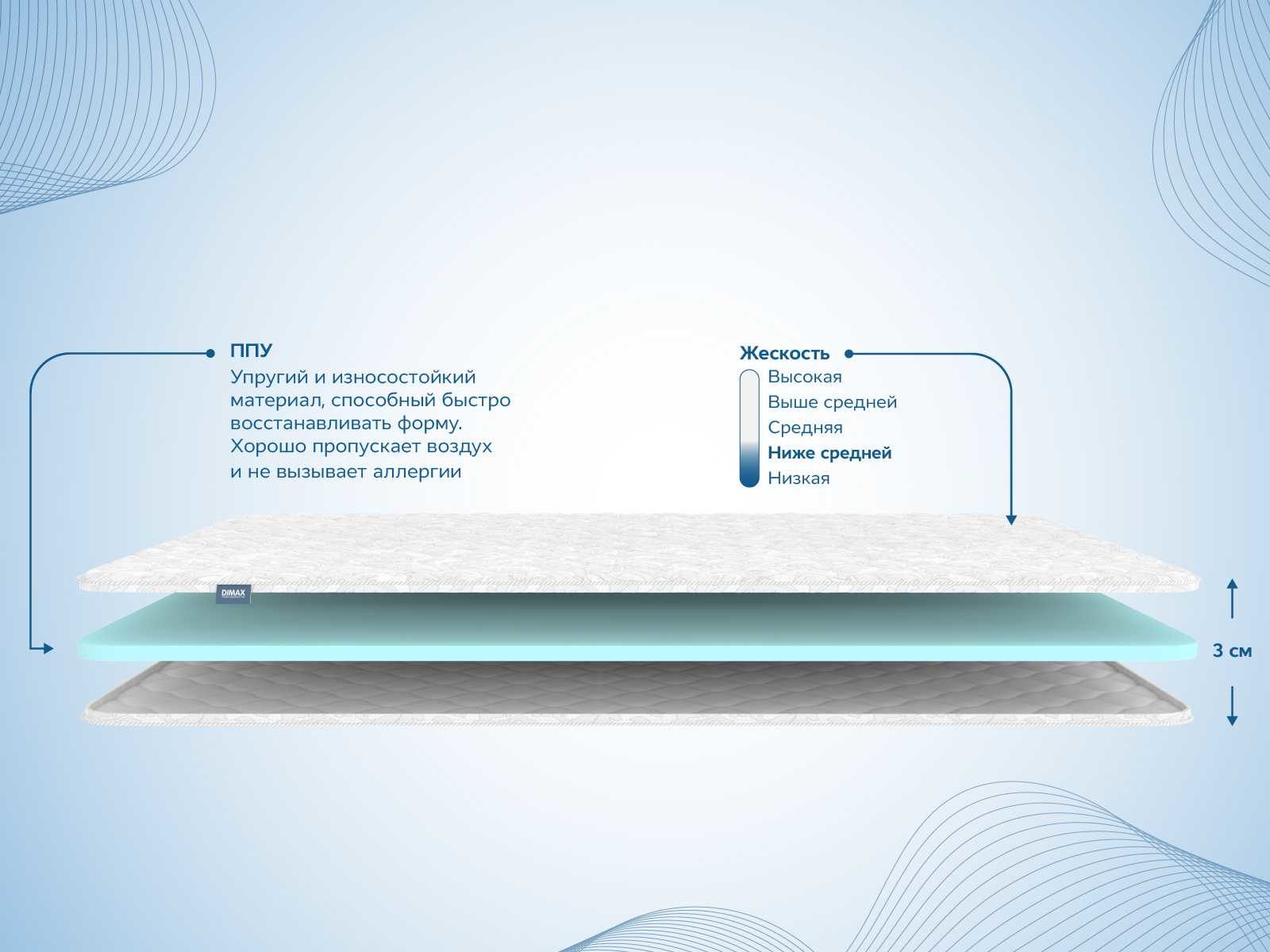 Ортопедический наматрасник Димакс Balance Foam 3 см — это мягкий и удобный топпер для вашего комфортного сна. Модель идеально подходит для тех, кто хочет смягчить излишне твёрдое спальное место, а также выровнять неровности и стыки базового матраса или раздвижного дивана.