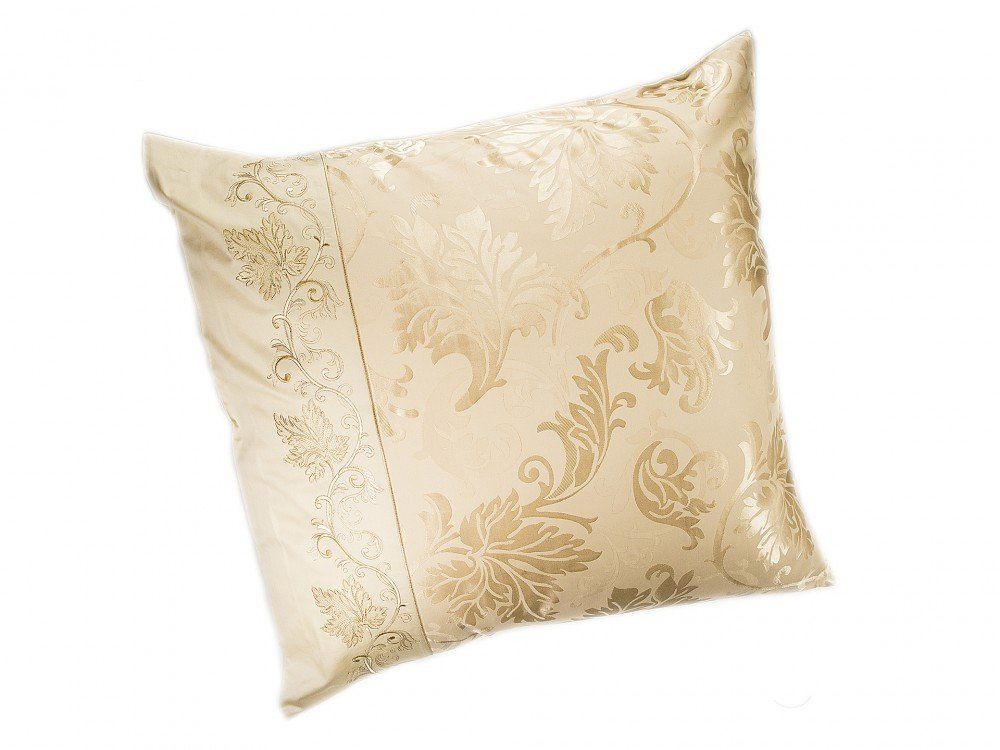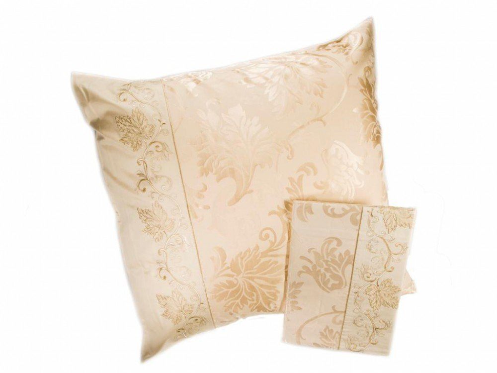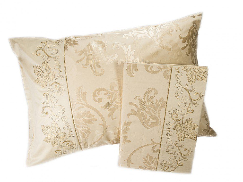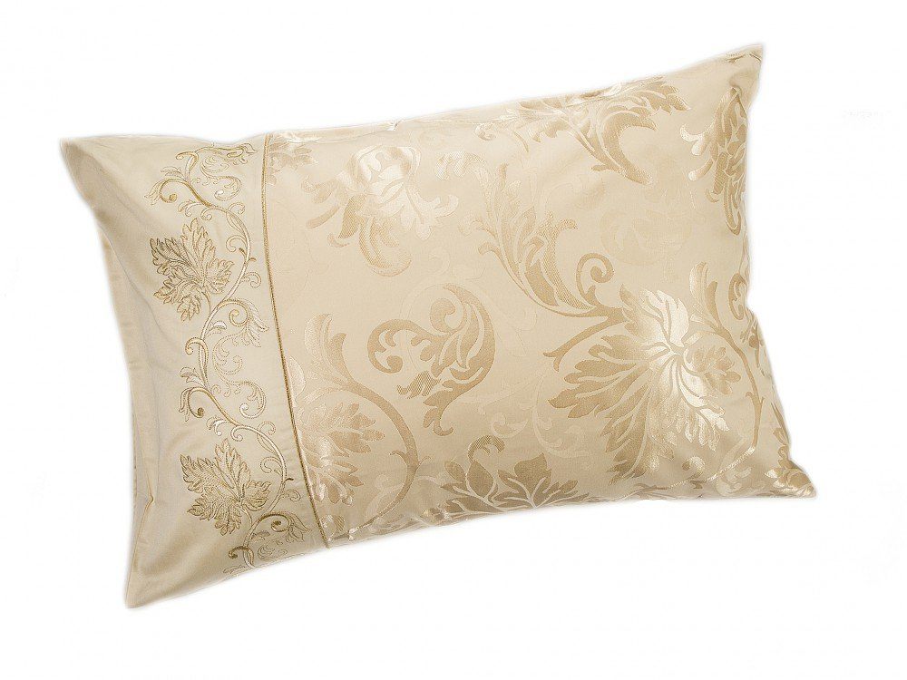 Комплект наволочек 50х70 см 2 шт. или 70х70 см 2 шт. цвета шампань. Верх наволочек из жаккардового люкс-сатина (55% вискоза, 45% хлопок), оборотная сторона люкс-сатин (100% хлопок). Отделка - богатая двухцветная вышивка. Наволочки закрываются на клапан. В комплекте 2 наволочки; упакованы в пакет из пвх с фирменным логотипом.
