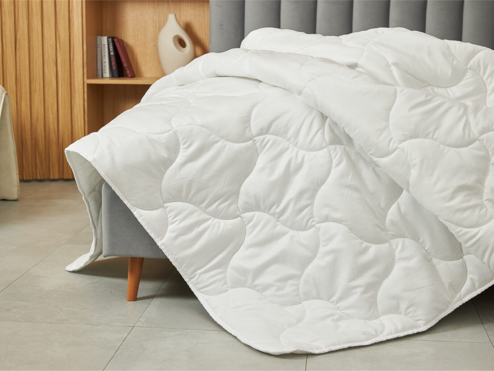 Простежка одеяла выполнена таким образом, чтобы наполнитель равномерно распределялся по всей площади, не сбивался в комки и не создавал холодных зон. Это обеспечивает равномерный согрев и комфортный сон.