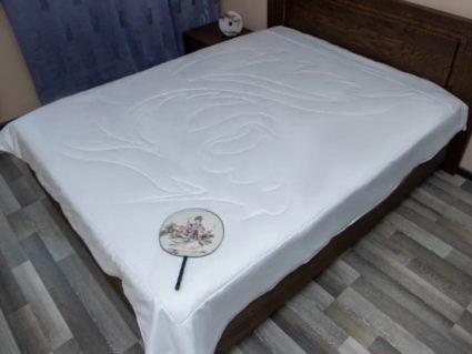 Легкое одеяло «Шелковый путь» — чрезвычайно пластичное, и от этого, невероятно уютное одеяло. Такие характеристики достигнуты за счет применения: сатина класса Люкс белого цвета, необыкновенно гладкого и очень приятного тактильно; искусственного шелкового волокна, которое является высокотехнологичным продуктом, изготовленным из натурального растительного сырья. Оригинальность коллекции придает индивидуальная стежка, выполненная программируемой одноигольной машиной. Ведь «Шелковый путь» — это Китай, а Китай – это традиционно драконы. Именно голова дракона изображена в виде стежки на одеяле этой коллекции.