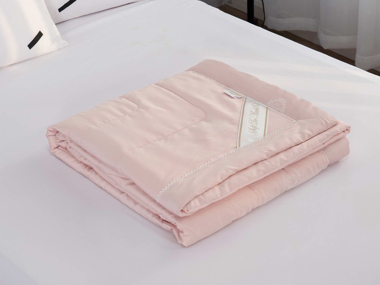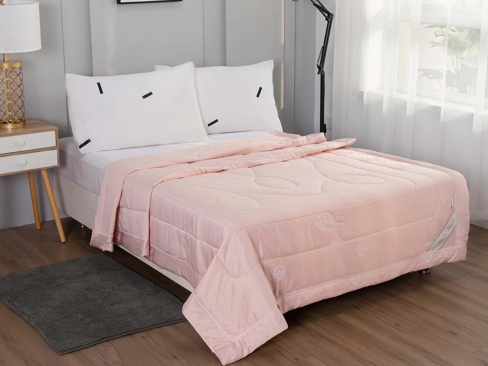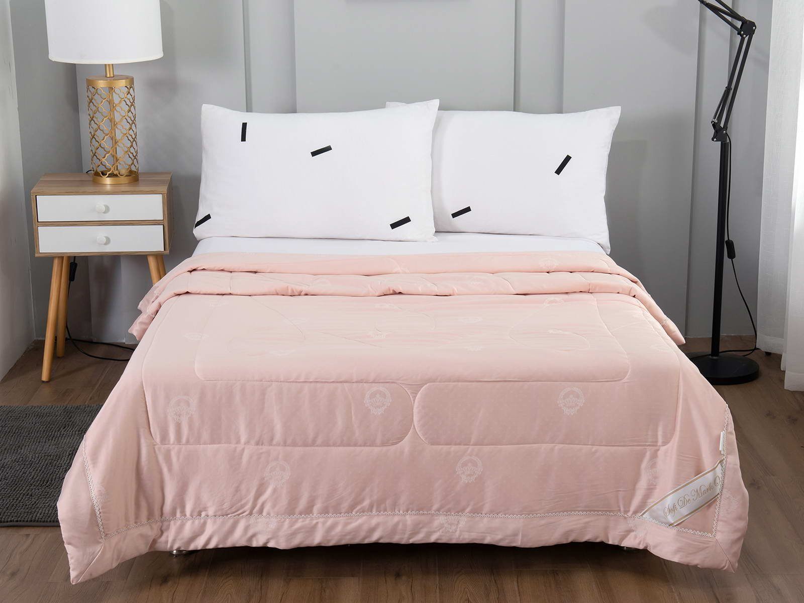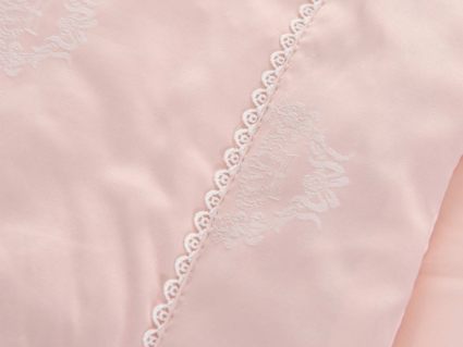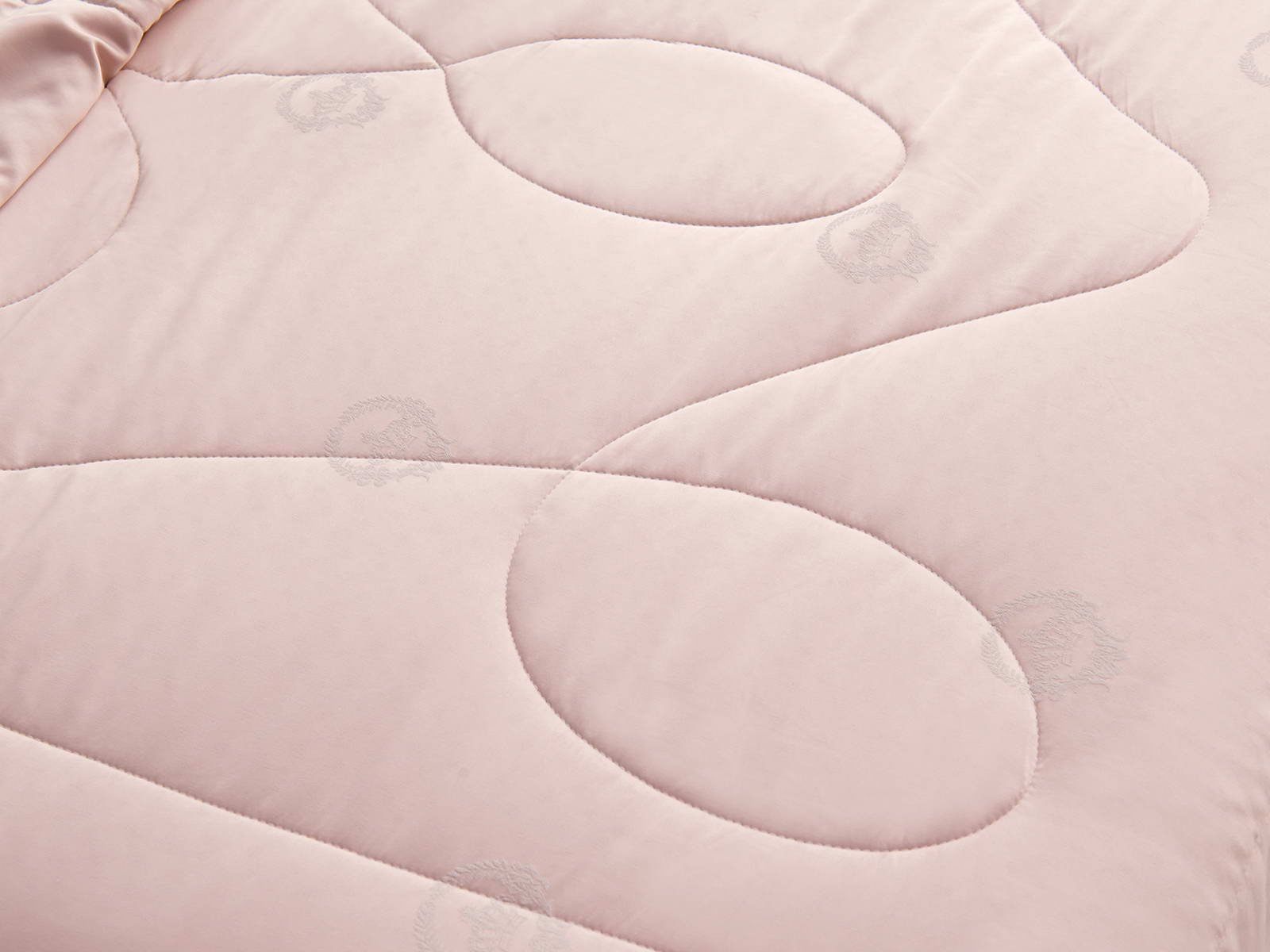 Одеяло представлено в модных цветах этого сезона: пудра, персик, крем, серый, карамель. Такие оттенки придадут нотки изысканности и утонченности вашей спальне. Изделие украшает декоративная стежка, создающая на одеяле прямые, изогнутые линии и окружности. С помощью специального станка на ткань нанесен уникальный повторяющийся рисунок в винтажном стиле. Вы можете выбрать узор на свой вкус: небольшой лавровый венок, венчающий корону, или одну из цветочных композиций среднего размера. По широкому канту в тон изделию проходит деликатная полоска светлого кружева.