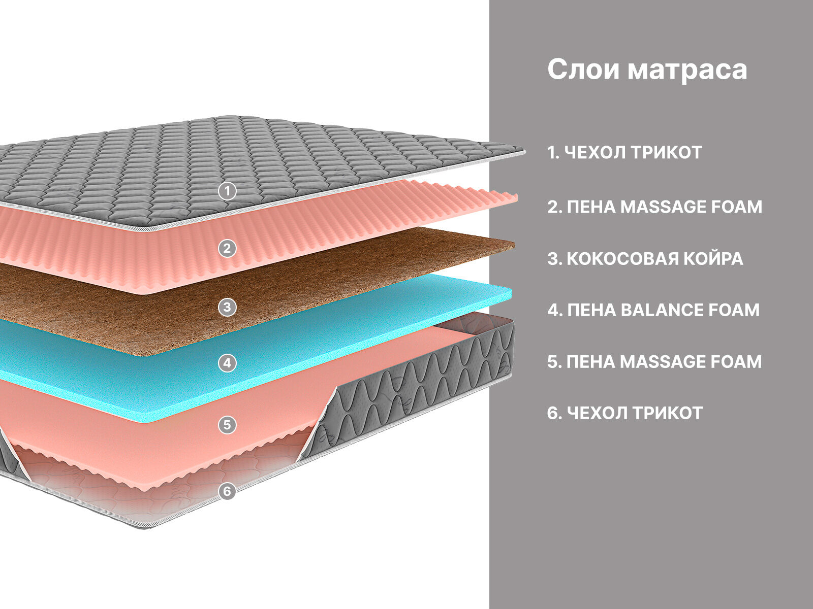Ортопедическая пена Balance foam забирает нагрузку на себя, а затем равномерно распределяет давление по всей площади матраса. В результате матрас хорошо переносит давление и не продавливается со временем.
