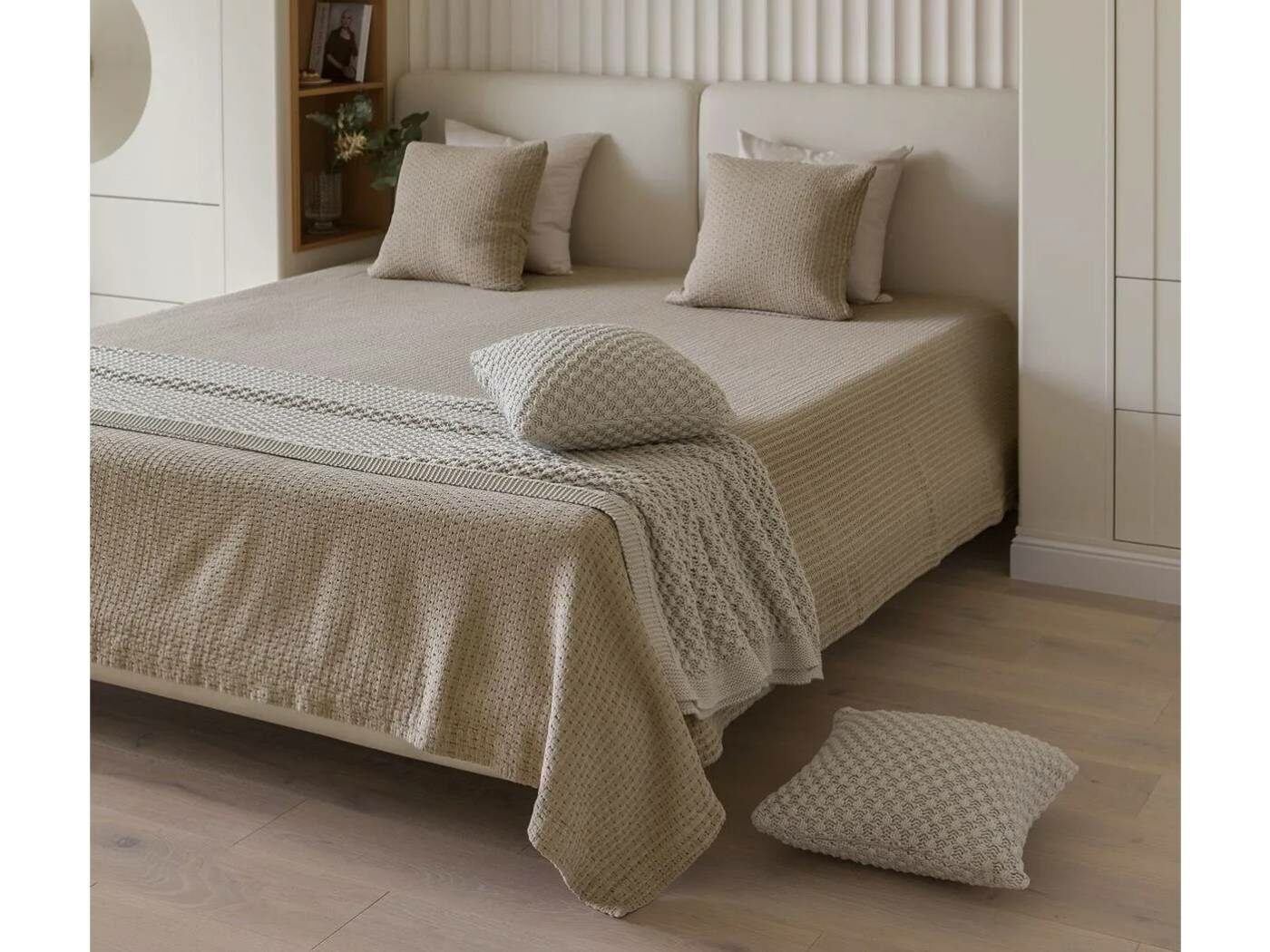 Оно подойдет для взрослых и детских спален, а также для того, чтобы накрыть диван. Органично впишется в стиль Japandy и Country.