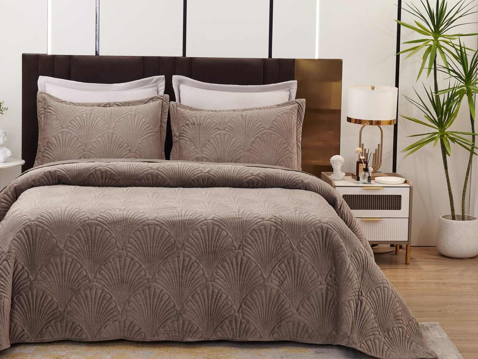 Роскошное велюровое покрывало Ариэль станет изюминкой любого интерьера, ведь оно потрясающе выглядит и приятное на ощупь. Обратите внимание на стежку покрывала – она выполнена в виде ракушек с эффектом 3D. Из-за особого плетения, велюровая ткань покрывала отражает свет и красиво переливается при различном освещении.