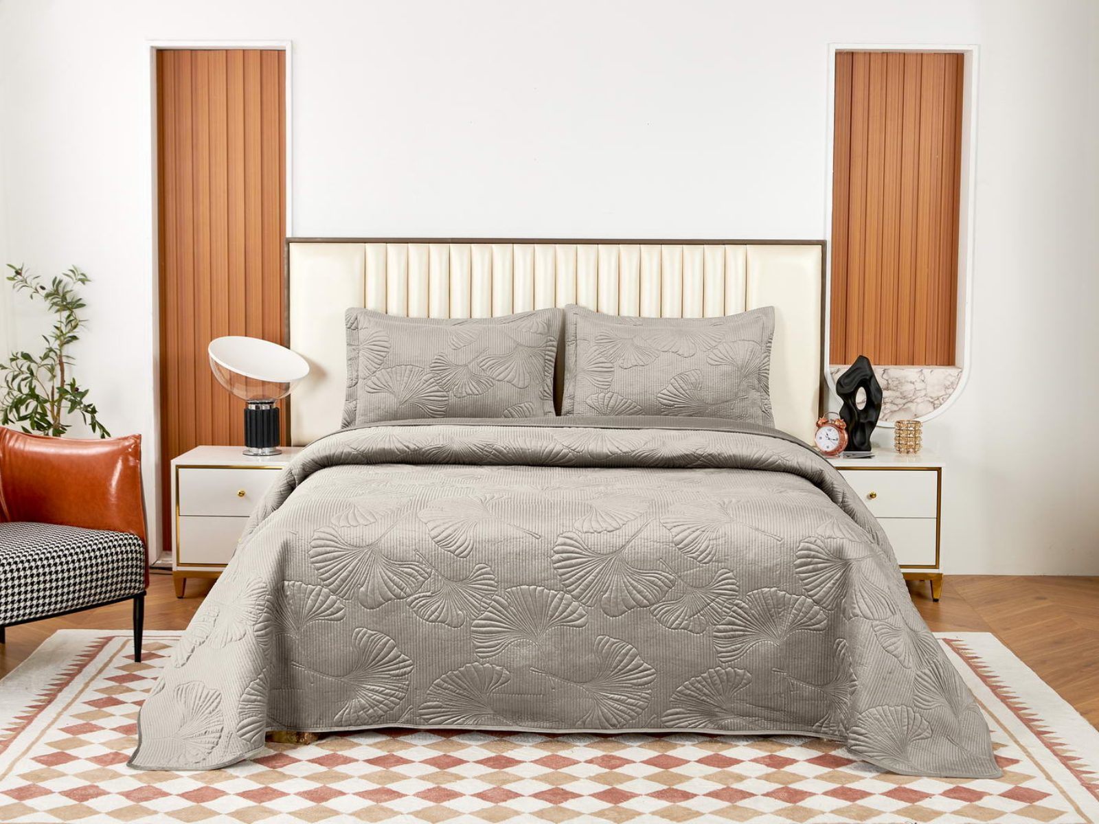 Роскошный растительный орнамент в виде вышивки добавит Вашей спальне элегантности и изысканности. Текстура цветочного узора будет сочетаться с другими элементами интерьера, такими как шторы, подушки, ковры и т.д.