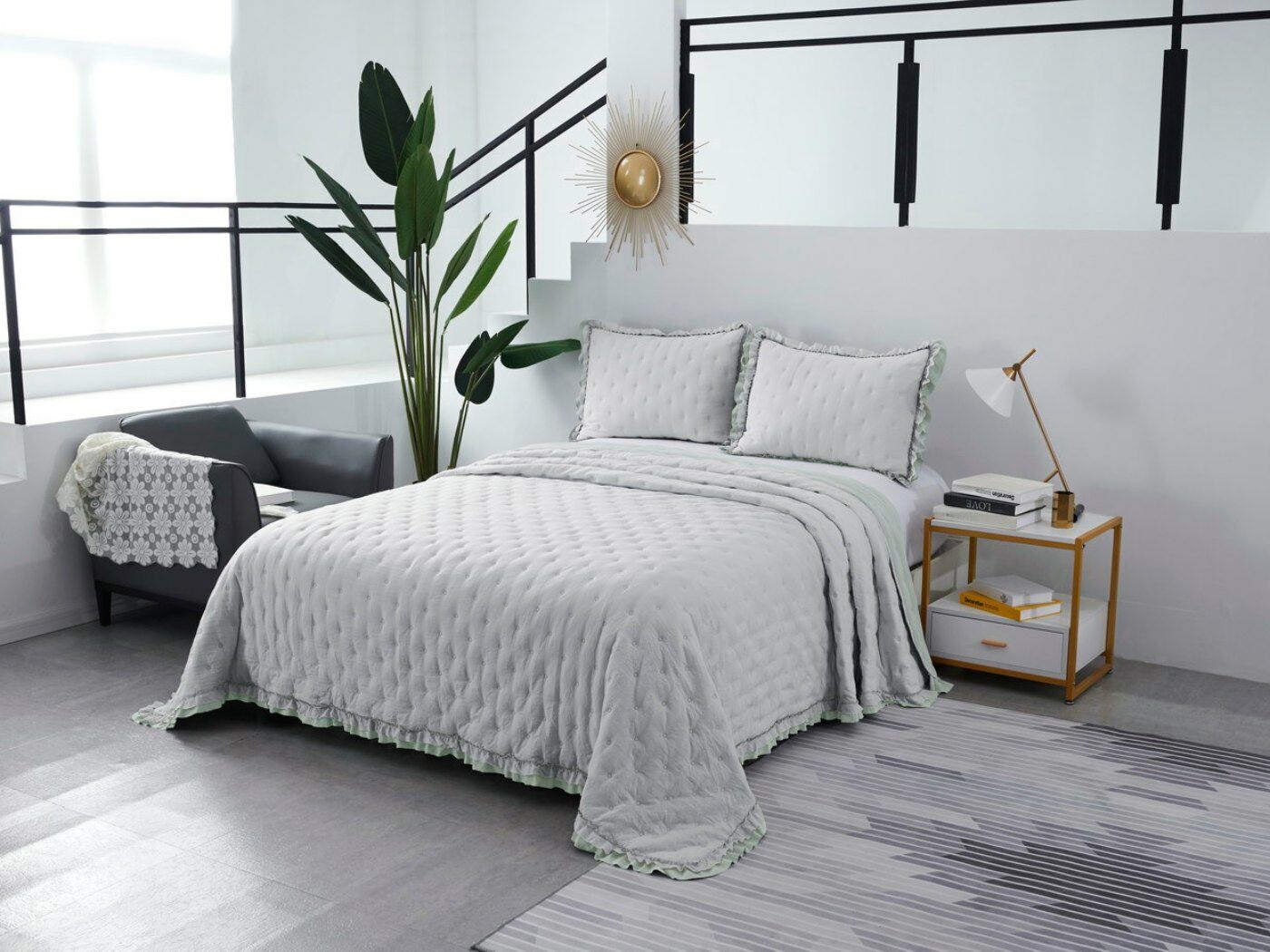 Покрывала выполнены в десяти оттенках, они подойдут для различных интерьеров, объединяет коллекцию потрясающее качество и приятный внешний вид. Изделия декорированы рюшами по краю, что подчеркивает из красоту и изысканность.