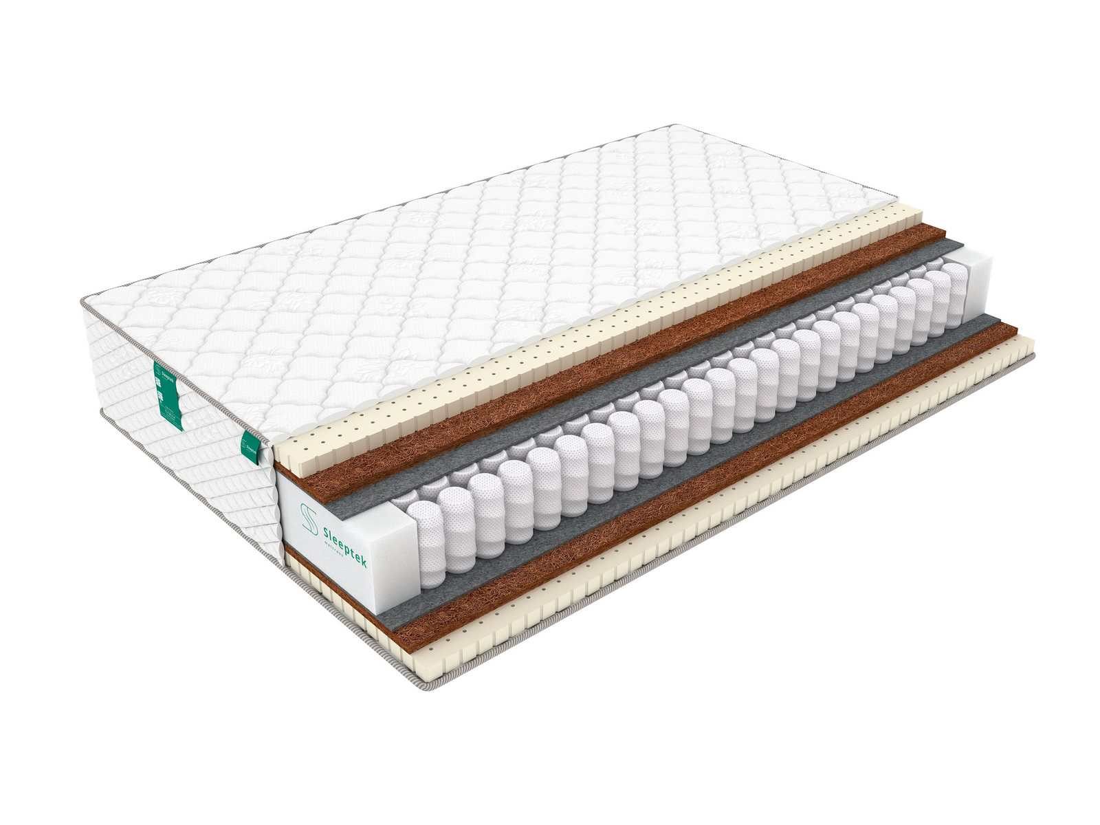 По обеим сторонам пружинного блока предусмотрены прослойки термовойлока, которые защищают наполнитель от повреждения пружинами. Поверх слоев войлока находятся плиты наполнителей – натурального латекса и койры кокоса. Жесткая койра придает матрасу ортопедические качества, а латекс смягчает спальную поверхность и обеспечивает комфорт. Оба наполнителя хорошо вентилируются, не накапливают влагу, пыль и посторонние запахи.