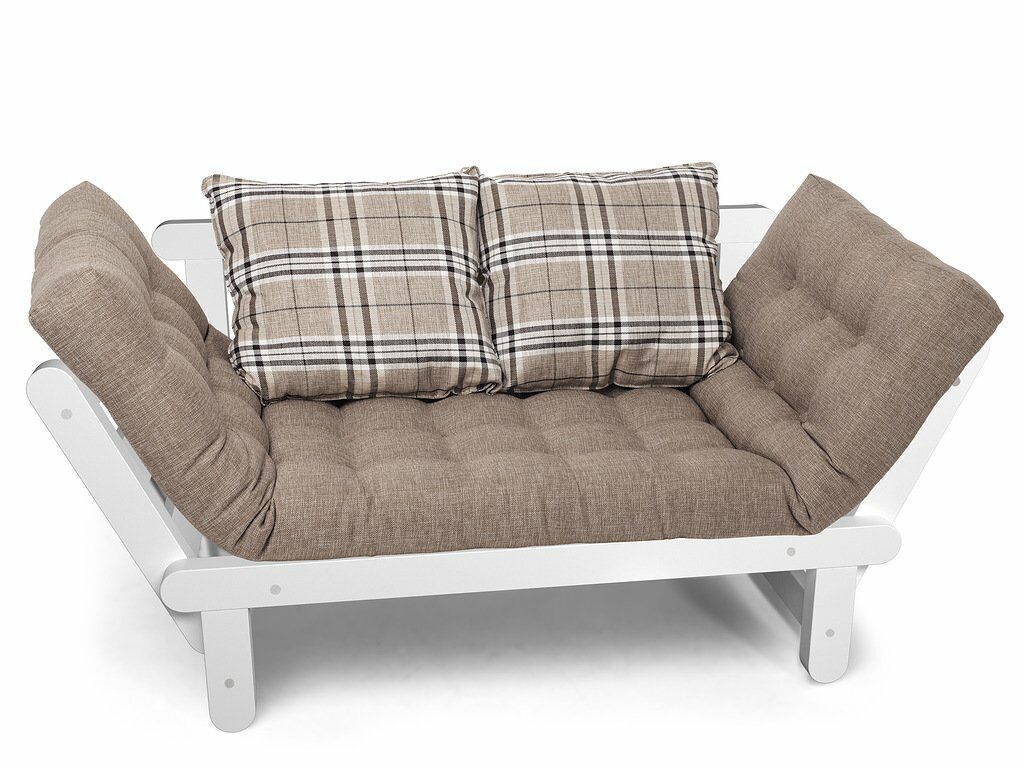 Каркас кушетки изготавливается из массива сосны. Откидные подлокотники имеют два положения, что позволяет, с комфортом разместится двум человекам.