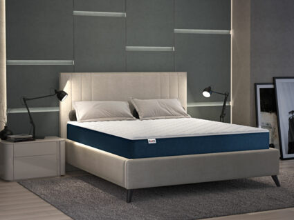Чехол матраса получил синий бурлет, выполненный из износостойкой мебельной ткани. Спальные поверхности чехла сшиты из мягкого трикотажа со стёжкой по слою синтепона для создания красивого рельефа и усиления комфортных свойств.