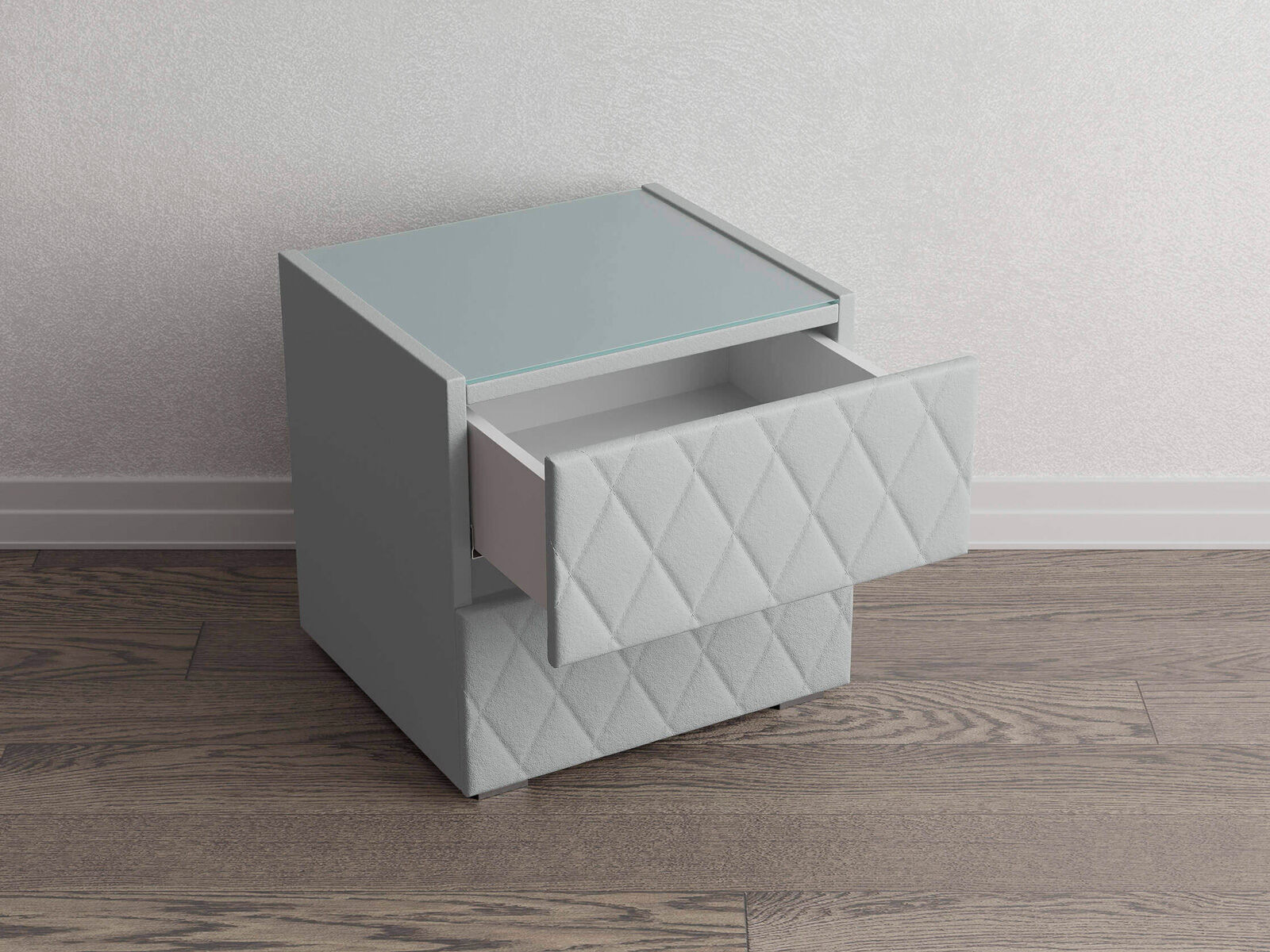Тумба с мягкими фасадами, украшенными изысканной стежкой в виде ромбов, представляет собой идеальное сочетание утонченного дизайна и функциональности. Два выдвижных ящика с направляющими скрытого монтажа оснащены доводчиками. Тумбу дополнительно можно укомплектовать стеклянной столешницей. Широкий выбор фактур и цветов исполнения.