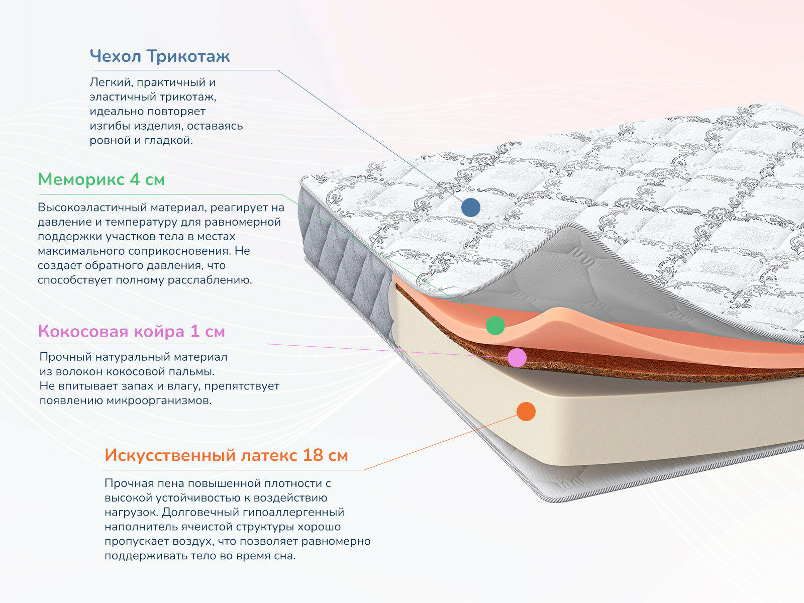 Эффект памяти формы позволяет матрасу подстраивается под потребности любого спящего, а скрученная упаковка и высокая нагрузочная способность делают его идеальным для переездов и жизни за городом.